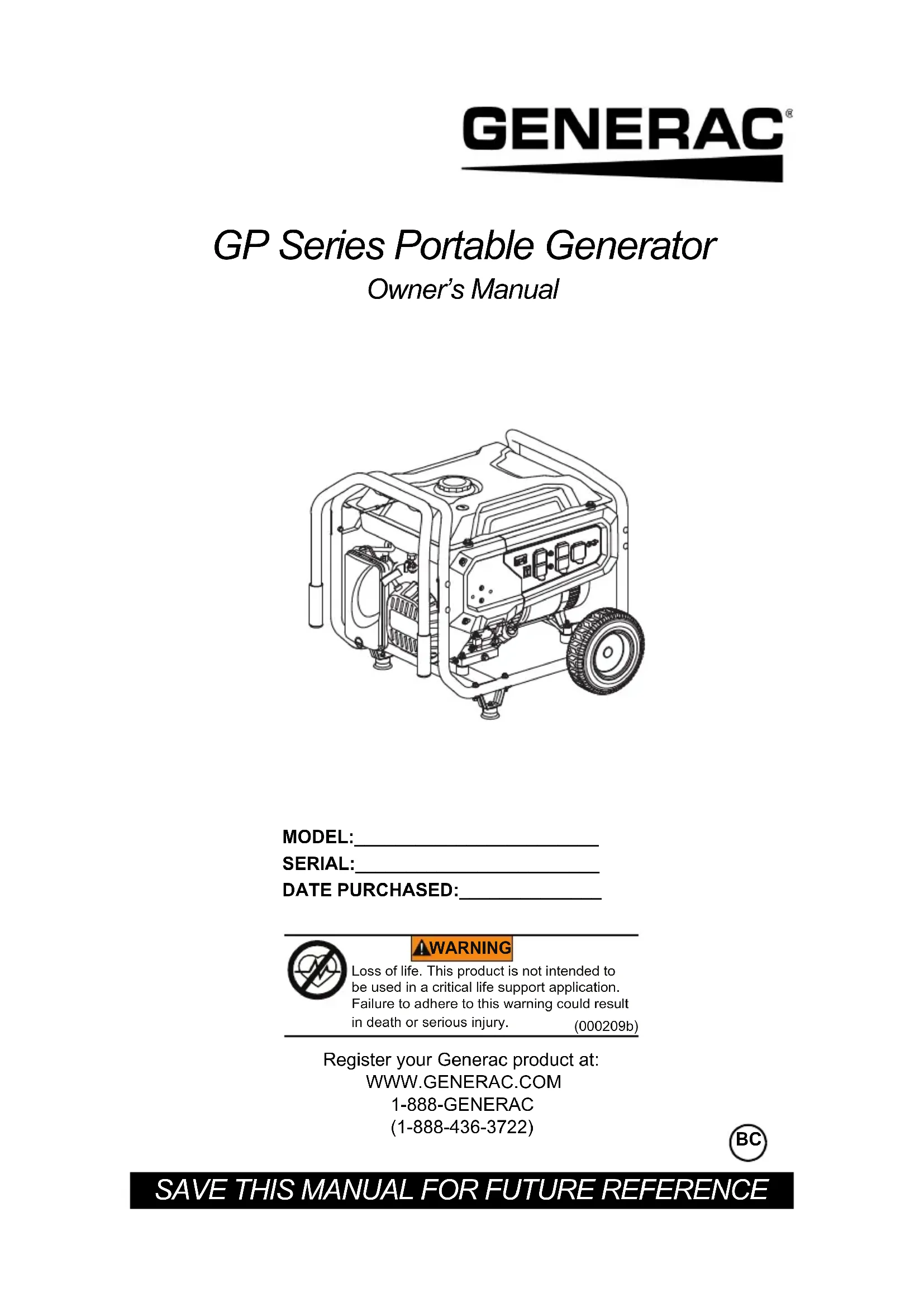 l’indicateur jaune clignotant en cas d’arrêt du générateur. Si le problème persiste et que le module COsense s’éteint, contactez un IASD. DE BATTERIE RAISON CORRECTIONManuel du propriétaire de générateur portatif 25 Schéma de câblage 010106Réf. 10000029705 Rev. C 04/09/2020 ©2020 Generac Power Systems, Inc. Tous droits réservés Les spécifications sont sujettes à modification sans préavis. Aucune forme de reproduction n’est autorisée sans le consentement écrit préalable de Generac Power Systems, Inc. Generac Power Systems, Inc. S45 W29290 Hwy. 59 Waukesha, WI 53189 1-888-GENERAC (1-888-436-3722) www.generac.com
