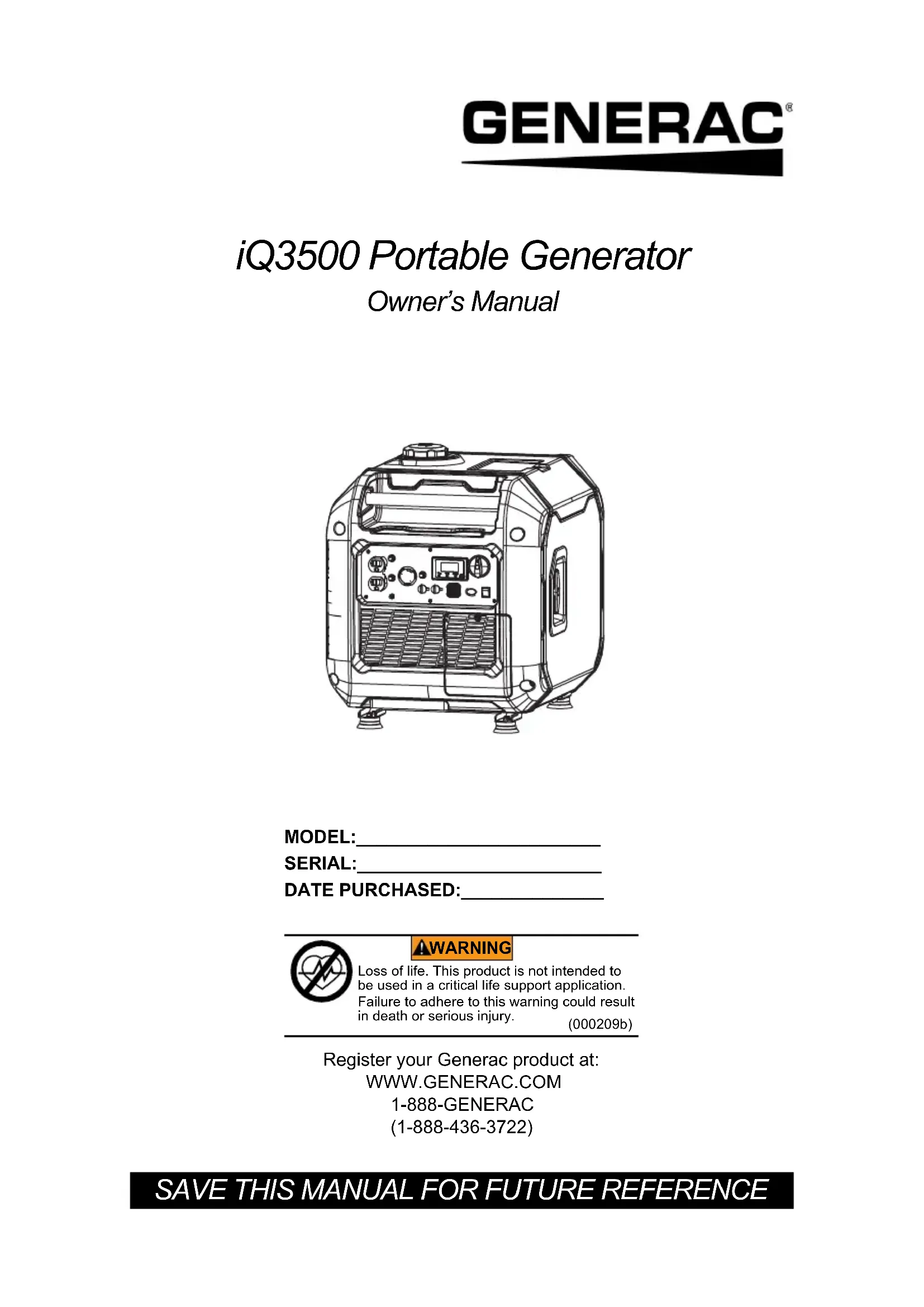 AVERTISSEMENT Danger de mort. Ce produit ne doit pas être utilisé dans une application critique de support de vie. Le non-respect de cet avertissement peut entraîner la mort ou des blessures graves.(000209b) Enregistrez votre produit Generac sur le site Internet :