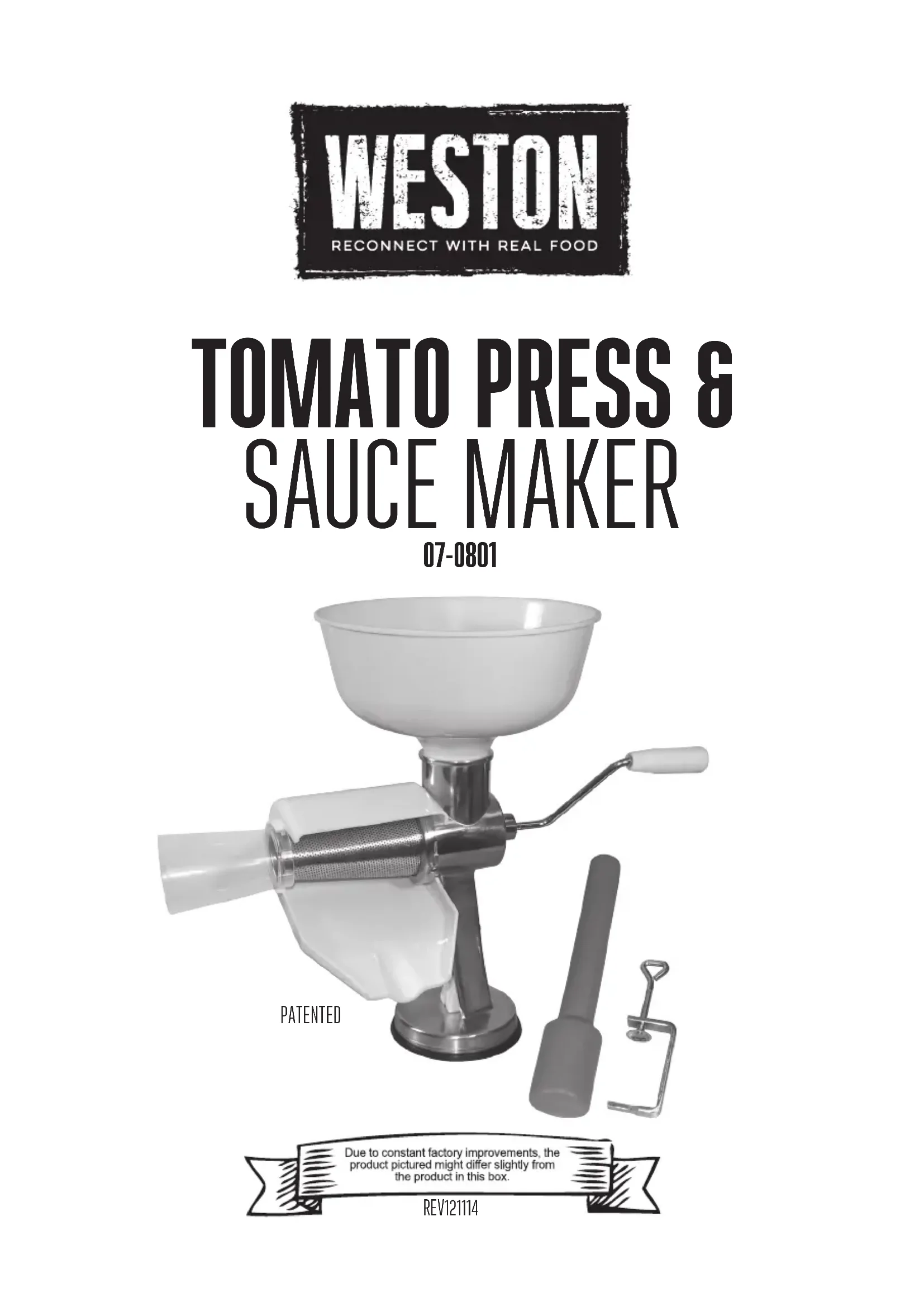Retirez le couvercle et remuez sur le feu pendant 5 à 10 minutes en plus ou jusqu’à ce que les légumes soient bien tendres et légèrement dorés. Ajoutez la sauce tomate, le sucre et le poivre Recouvrez et laissez mijoter pendant 15 minutes Servez ou laissez refroidir puis réfrigérez ou congelez SAUCE MARINARA INGRÉDIENTS 1 TASSE DE CAROTTES, FINEMENT COUPÉES3 OIGNONS DE TAILLE MOYENNE, COUPÉS2,72 KG (6 LB) DE PURÉE DE TOMATE BIEN MÛRES À L’ITALIENNE3 C.À.S. DE SUCRE BRUN1 TASSE D’OIGNON, FINEMENT COUPÉ1/2 TASSE DE CÉLERI, FINEMENT COUPÉ1/2 DE TASSE D’HUILE D’OLIVE 1 C. À THÉ DE SUCRE ET DU POIVRE BLANC MOULU POUR LE GOÛTASSAISONNEMENT FACULTATIF (AU CHOIX): 2 C. À THÉ DE CORIANDRE MOULU 1/2-1 C. À THÉ DE MARJOLAINE SÉCHÉE1 C.À THÉ DE BASILIC SÉCHÉ 1/4 À 1/2 C. À THÉ ORIGAN SÉCHÉ1 À 2 C. À THÉ DE SELWeston Products LLC garantit à l’ACHETEUR AU DÉTAIL D’ORIGINE de ce produit contre tout défaut en matériau et en main-d’œuvre pendant un (1) an a partir de la date d’achat à condition qu’il soit utilisé conformément aux directives imprimées qui y sont jointes. La Carte de Garantie, avec une copie du reçu original, doivent être reçus par Weston Products LLC dans les trente (30) jours à partir de la date d’achat pour que la garantie puisse s’appliquer. Le manque d’envoyer la Carte de Garantie complètement remplie avec une copie du reçu original annulera la garantie. Le produit doit être livré à ou expédié franco de port à Weston Products LLC pour les services de garantie, soit dans son emballage d’origine ou un emballage similaire offrant un degré de protection équivalent. Les dommages causés par l’expédition ne sont pas la responsabilité de la société. Weston Products LLC charge 35,00 $ par heure pour frais de service. REMARQUE : Aucune réparation ne sera commencée sans l’autorisation du client. Les frais d’expédition de retour seront ajoutés à la facture de réparation. Avant de renvoyer le produit pour une réparation sous garantie, bien nettoyer le produit pour qu’il soit exempt de toute particule alimentaire ou autres débris. Si l’acheteur ne respecte pas cette consigne, le produit lui sera renvoyé sans avoir été réparé. Dans certains, la somme de 50 dollars sera facturée pour le nettoyage. Weston Products LLC réparera (ou à sa discrétion, remplacera) le produit sans frais, si à l’opinion de la société, il a été prouvé être défectueux en matériau et en main d’œuvre dans la période de garantie. Des remplacements neufs ou remis en état pour les pièces d’usine défectueuses seront fournis pendant un (1) an à partir de la date d’achat. Les pièces de remplacement sont garanties pour le reste de la période de garantie originale. Pour les réparations non garanties, veuillez contacter le Service à la clientèle de Weston Products LLC au numéro sans frais 1-800-814-4895, du lundi au vendredi, de 8h00 à 17h00 ET (en dehors des États-Unis : 001-440-638-3131) pour obtenir une Autorisation de retour d’article (Numéro RMA). Weston Products LLC refusera tous les retours qui ne contiennent pas ce numéro. NE PAS RENVOYER CET APPAREIL SANS L’AUTORISATION CORRECTE DE Weston Products LLC. LIMITATIONS : La garantie est annulée si le produit est utilisé pour toute raison autre que pour laquelle il est conçu. Le produit ne doit pas avoir été antérieurement modié, réparé, ou entretenu par quelqu’un autre que Weston Products LLC. Le cas échéant, le numéro de série ne doit pas être modié ou enlevé. Le produit ne doit pas avoir été soumis à un accident en transit ou pendant qu’il est en la possession du client, mal utilisé, mal traité, ou utilisé contrairement aux directives contenues dans le manuel d’utilisation. Ceci comprend la défaillance causée par la négligence d’un entretien raisonnable et nécessaire, une tension de secteur incorrecte et des catastrophes naturelles. Cette garantie n’est pas transférable et s’applique seulement aux ventes américaines et canadiennes. À l’exception des cas où la loi en vigueur l’interdit, aucune autre garantie, expresse ou implicite, y compris les garanties relatives au caractère adéquat pour la commercialisation ou un usage particulier, ne s’appliquera à ce produit. Weston Products LLC ne sera en aucun cas responsable des dommages indirects liés au dit produit et Weston Products LLC n’a aucune obligation ni responsabilité autre que celles expressément établies dans la présente, et n’autorise aucun représentant ou autre personne à les assumer pour lui. Toutes garanties implicites applicables sont aussi limitées à la période d’un (1) an de la garantie limitée. Cette garantie couvre seulement le produit et ses pièces spéciques, pas les aliments ou autres produits traités dans celui-ci. Weston n’est pas responsable des pièces manquantes ou endommagées pour les articles réduits/en solde ou les articles naux de vente où le vendeur peut ne pas être en mesure de garantir l’ensemble de la fonctionnalité ou l’intégralité de l’unité.DÉCOUPEZ LE LONG DE LA LIGNE POINTILLÉE ET ENVOYEZ CETTE CARTE DE GARANTIE AVEC UNE COPIE DE VOTRE REÇU D’ACHAT ORIGINAL À :Weston Products LLC / WARRANTY20365 Progress Drive, Strongsville, OH 44149 USA