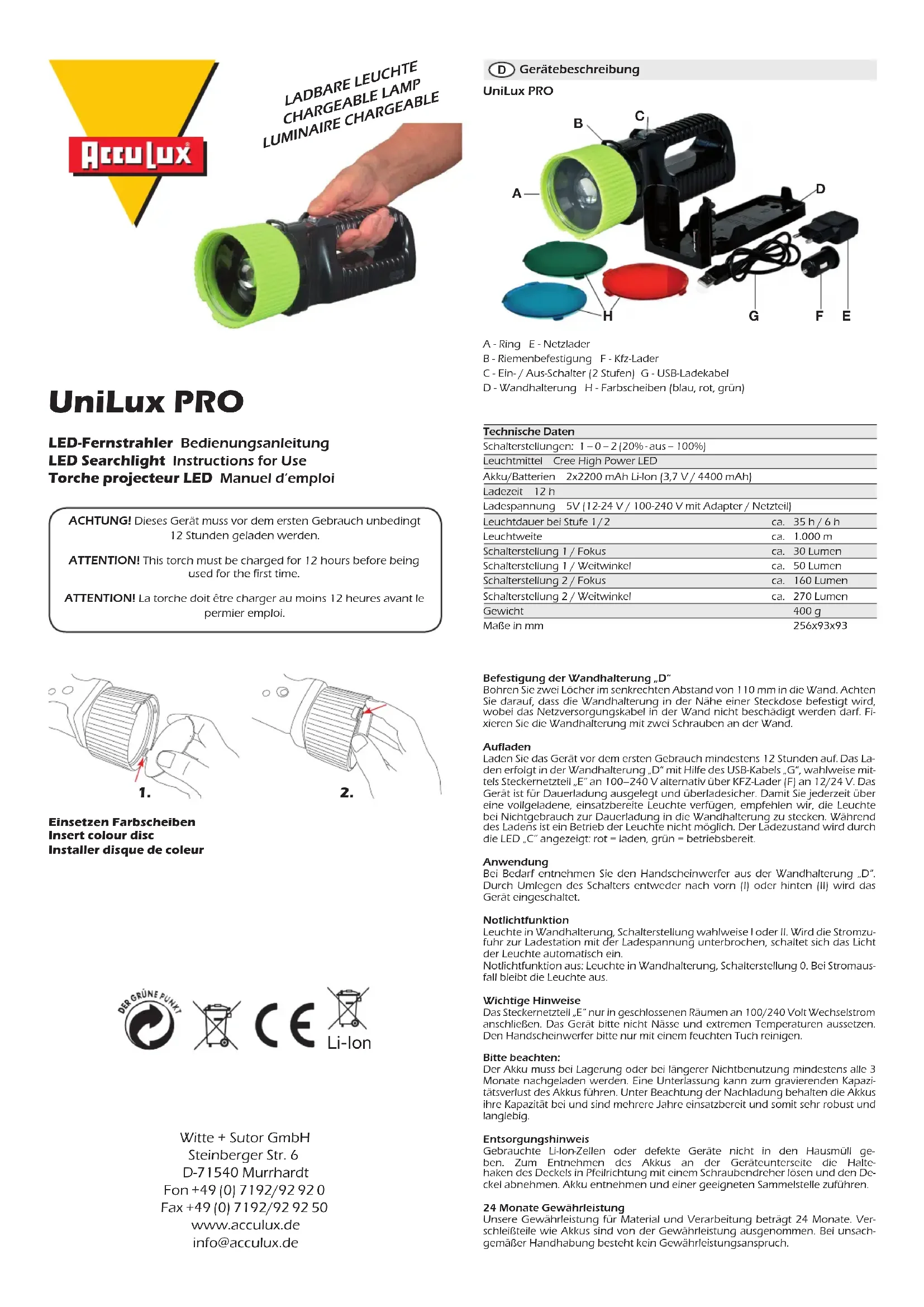 Gerätebeschreibung UniLux PROA - Ring E - NetzladerB - Riemenbefestigung F - Kfz-Lader C - Ein- / Aus-Schalter (2 Stufen) G - USB-LadekabelD - Wandhalterung H - Farbscheiben (blau, rot, grün)Technische Daten Schalterstellungen: 1 – 0 – 2 (20% - aus – 100%)Leuchtmittel Cree High Power LEDAkku/Batterien 2x2200 mAh Li-Ion (3,7 V / 4400 mAh)Ladezeit 12 h Ladespannung 5V (12-24 V / 100-240 V mit Adapter / Netzteil) Leuchtdauer bei Stufe 1 / 2 ca. 35 h / 6 h Leuchtweite ca. 1.000 m Schalterstellung 1 / Fokus ca. 30 Lumen Schalterstellung 1 / Weitwinkel ca. 50 Lumen Schalterstellung 2 / Fokus ca. 160 Lumen Schalterstellung 2 / Weitwinkel ca. 270 LumenGewicht 400 g Maße in mm 256x93x93 1. 2.Fitting the wall fixing “D” Drill two holes in the wall, 110 mm apart verti-cally. Ensure that the wall fixing is fitted close to a plug socket. Take care not to damage the mains supply cable when drilling the holes in the wall. Now use two screws to fasten the wall fixing to the wall. Charging Charge the torch for at least 12 hours before using for the first time. It is charged in the wall fixing “D” with the aid of the wall plug trans-former “G”. The torch is designed for continuous charging and is protected against overcharging. We recommend returning the torch to the wall fixing when not in use to ensure a fully-charged torch is available for use at all times. It is not possible to use the torch while it is being charged. The charging status is indicated through the LED (C): red = charging, green = ready to use. Use To use, remove the torch from the wall fixing “D”. To switch it on, push the switch “B” forward. If necessary remove the portable spotlight from the wall mounting “D”. The device is switched on by moving the switch either forwards (I) or back-wards (II). Important information Only connect the wall plug transformer “E” to an indoor 100/240 Volt alternating current supply. Do not expose the torch to wet weather and extreme temperatures. Always use a damp cloth to clean the torch. Emergency light functionWall-mounted lamp, switch setting either I or II. If the current supply to the charging station is interrupted, the light of the lamp switches itself on auto-matically.Emergency light function off: Wall-mounted lamp, switch setting 0. In the event of a power failure the lamp remains offPlease note:If stored or not used for a longer period of time, the rechargeable battery must be recharged at least once every three months. Failure to do so may lead to a seri-ous reduction in battery capacity. If regularly recharged, the batteries keep their capacity and are ready to use for several years and thus extremely robust and long-lived.Disposal information Do not throw defective Li-Ion cells or defective torches in the domestic waste. To re-move the battery, undo the fixing hook of the cover on the underside of the torch by turning in the direction of the arrow using a screwdriver and remove the cover. Remove the battery and dispose of in a suitable place (battery collection point). 24 months warranty for defectsThe manufacturer grants 24 months warranty for defects on faulty materials and workmanship. Rechargeable batteries are excluded of this warranty for defects. War-ranty for defect claims cannot be accepted in case of incorrect handling or repair.Montage de la fixation murale « D » Percez deux trous dans le mur avec un espace vertical de 110 mm. Assurez que la fixation murale soit bien fixé en proximité d’une prise et que le cable d’alimentation ne soit pas endomagé. Fixez la fixation murale au mur avec deux visses. Chargement Charger la torche au moins 12 heures avant le permier emploi. Le chargement s’effectue dans la fixation murale «D» par le transformateur d’alimentation «G» L’appareil à été conçu pour des chargements permanents et est fiable au surchar-gement. Pour assurer la disposition d’un luminaire complètement chargé, nous re-commandons de le laisser branché dans la fixation pour un chargement permanent durant le temps de non utilisation. Le luminaire ne peut être allumé durant le char-gement. L’état de charge est indiqué par la LED (C) : rouge = charger, verte = prêt à l’usage Emploi Vous pouvez retirer la torche projecteur de la fixation murale «D» en cas de besoin. Basculer l’interrupteur pour allumer l’appareil. En cas de besoin, retirez le pro-jecteur portatif du support mural « D ». Lors du positionnement du commutateur vers l’avant (I) ou vers l’arrière (II), l’appareil est mis en marche. Avertissement Le transformateur d’alimentation «E» doit être branché uniquement au courant al-ternatif de 100/240 Volt. Ne pas exposer l’appareil à l’humidité ou à des tempéra-tures extrêmes. Nettoyez la torche projecteur uniquement avec un tissu moite. Fonction d’éclairage de secoursLampe sur le support mural, position du commutateur sur I ou II au choix. Si l’alimentation électrique de la base de chargement est interrompue par la tension de charge, la lampe s’allume automatiquement.Fonction d’éclairage de secours éteinte : lampe sur le support mural, position du commutateur sur 0. En cas de panne d’électricité, la lampe reste éteinte.Remarque :La batterie doit être chargée au minimum une fois tous les 3 mois en cas de stocka-ge ou de non-utilisation prolongée. En cas d‘omission, il existe un risque de perte grave de capacité de la batterie. Si les consignes de chargement sont respectées, la batterie conserve sa capacité, elle reste ainsi prête à l‘emploi pendant plusieurs années et est donc très solide et résistante.Elimination des déchets Ne pas jeter des cellules Li-Ion usées ou des appareils défectueux avec les déchets domesti-ques. Retirez la batterie rechargeable, en dévis-sant les crochets du cou-vercle du bas de la coque en direction de la flèche avec un tournevis et soulevez le couvercle. Retirez la batterie rechargeable et jetezla dans un récip