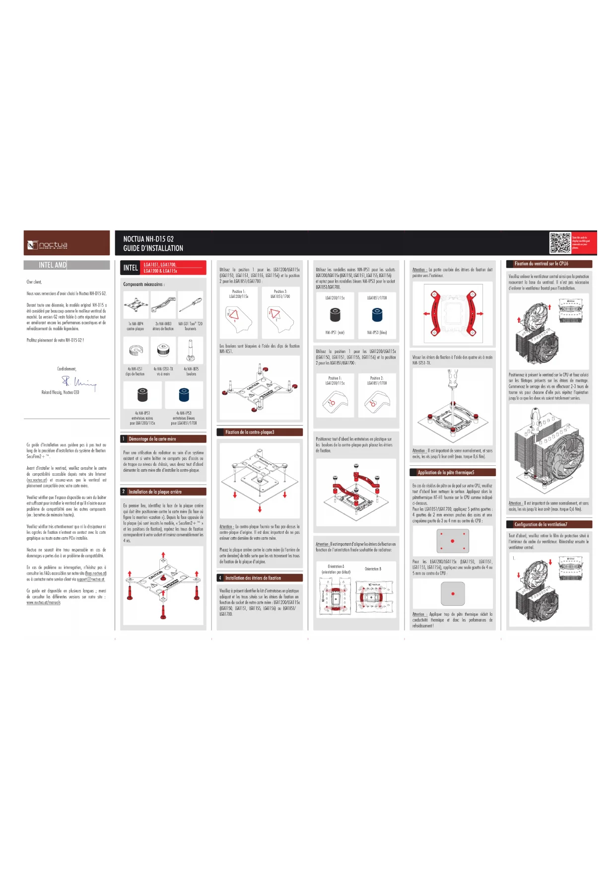 NM-IPS3 (bleu) LGA1851/1700 NM-IPS1 (noir) LGA1200/115x Positionnez tout d’abord les entretoises en plastique sur les boulons de la contre-plaque puis placez les étriers de fixation. Attention : La partie courbée des étriers de fixation doit pointer vers l’extérieur. Vissez les étriers de fixation à l’aide des quatre vis à main NM-STS1-TX. Attention : Il est important de serrer normalement, et sans excès, les vis jusqu’à leur arrêt (max. torque 0,6 Nm). En cas de résidus de pâte ou de pad sur votre CPU, veuillez tout d’abord bien nettoyer la surface. Appliquez alors la pâtethermique NT-H1 fournie sur le CPU comme indiqué ci-dessous. Pour les LGA1851/LGA1700, appliquez 5 petites gouttes : 4 gouttes de 2 mm environ proches des coins et une cinquième goutte de 3 ou 4 mm au centre du CPU : Utilisez la position 1 pour les LGA1200/LGA115x (LGA1150, LGA1151, LGA1155, LGA1156) et la position 2 pour les LGA1851/LGA1700 : Position 1: LGA1200/115x Position 2: LGA1851/1700 Ce guide d’installation vous guidera pas à pas tout au long de la procédure d’installation du système de fixation SecuFirm2+™. Avant d’installer le ventirad, veuillez consulter le centre de compatibilité accessible depuis notre site Internet (ncc.noctua.at) et assurez-vous que le ventirad est pleinement compatible avec votre carte mère. Veuillez vérifier que l’espace disponible au sein du boîtier est suffisant pour installer le ventirad et qu’il n’existe aucun problème de compatibilité avec les autres composants (ex : barrettes de mémoire hautes). Veuillez vérifier très attentivement que ni le dissipateur ni les agrafes de fixation n’entrent en contact avec la carte graphique ou toute autre carte PCIe installée. Noctua ne saurait être tenu responsable en cas de dommages u pertes dus à un problème de compatibilité. En cas de problème ou interrogation, n’hésitez pas à consulter les FAQs accessibles sur notre site (faqs.noctua.at) ou à contacter notre service client via support@noctua.at. Ce guide est disponible en plusieurs langues ; merci de consulter les différentes versions sur notre site : www.noctua.at/manuals Cher client, Nous vous remercions d’avoir choisi le Noctua NH-D15 G2. Durant toute une décennie, le modèle original NH-D15 a été considéré par beaucoup comme le meilleur ventirad du marché. La version G2 reste fidèle à cette réputation tout en améliorant encore les performances acoustiques et de refroidissement du modèle légendaire. Profitez pleinement de votre NH-D15 G2 ! Cordialement, Roland Mossig, Noctua CEO Scan this code to display multilingual manuals on your phone.