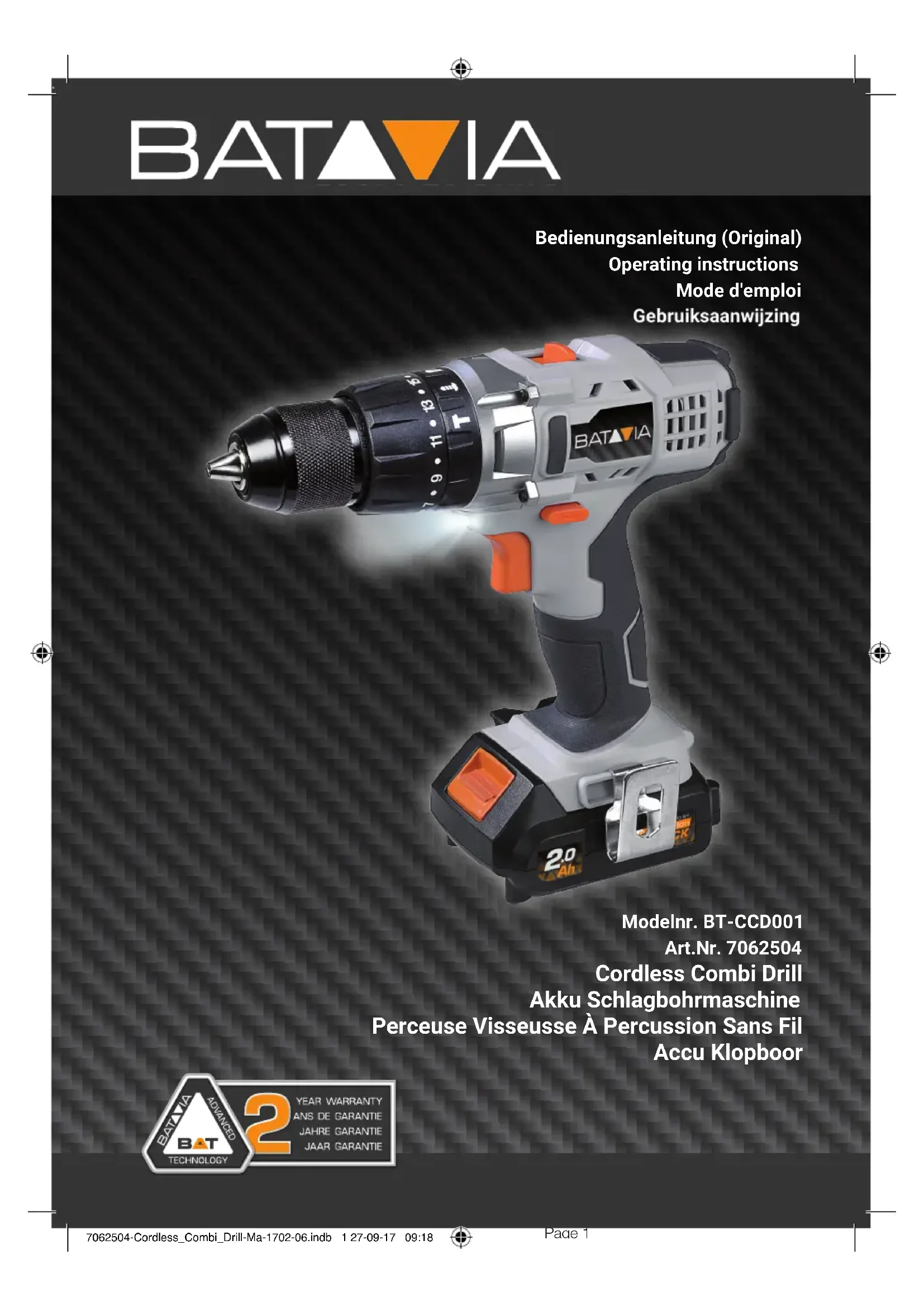 Nous, Batavia GmbH, Weth. Buiten- huisstraat 2a, NL-7951 SM Staphorst, déclarons sous notre seule responsabilité que le produit Perceuse Visseuse à Percussion sans Fil, Modèle BT–CCD001, Nº d'article 7062504 satisfait les principales exigences de protection dénies dans les directives européennes com- patibilité électromagnétique (CEM) 2014/30/EU, 2006/42/CE (machines), 2011/65/EU ainsi que les modications y apportées. Pour évaluer la conformité nous avons eu recours aux normes harmonisées ci-dessous: EN 55014-1:2006+A1+A2, EN 55014-2:2015, EN 60745-1:2009+A11, EN 60745-2-1:2010, EN 60745-2-2:2010 Staphorst, le 25 avril 2017 Meino Seinen, Responsable de qualité Batavia GmbH, Weth. Buitenhuisstraat 2a, 7951 SM Staphorst, Pays-Bas 7062504-Cordless_Combi_Drill-Ma-1702-06.indb 16 27-09-17 09:1817 Nederlands