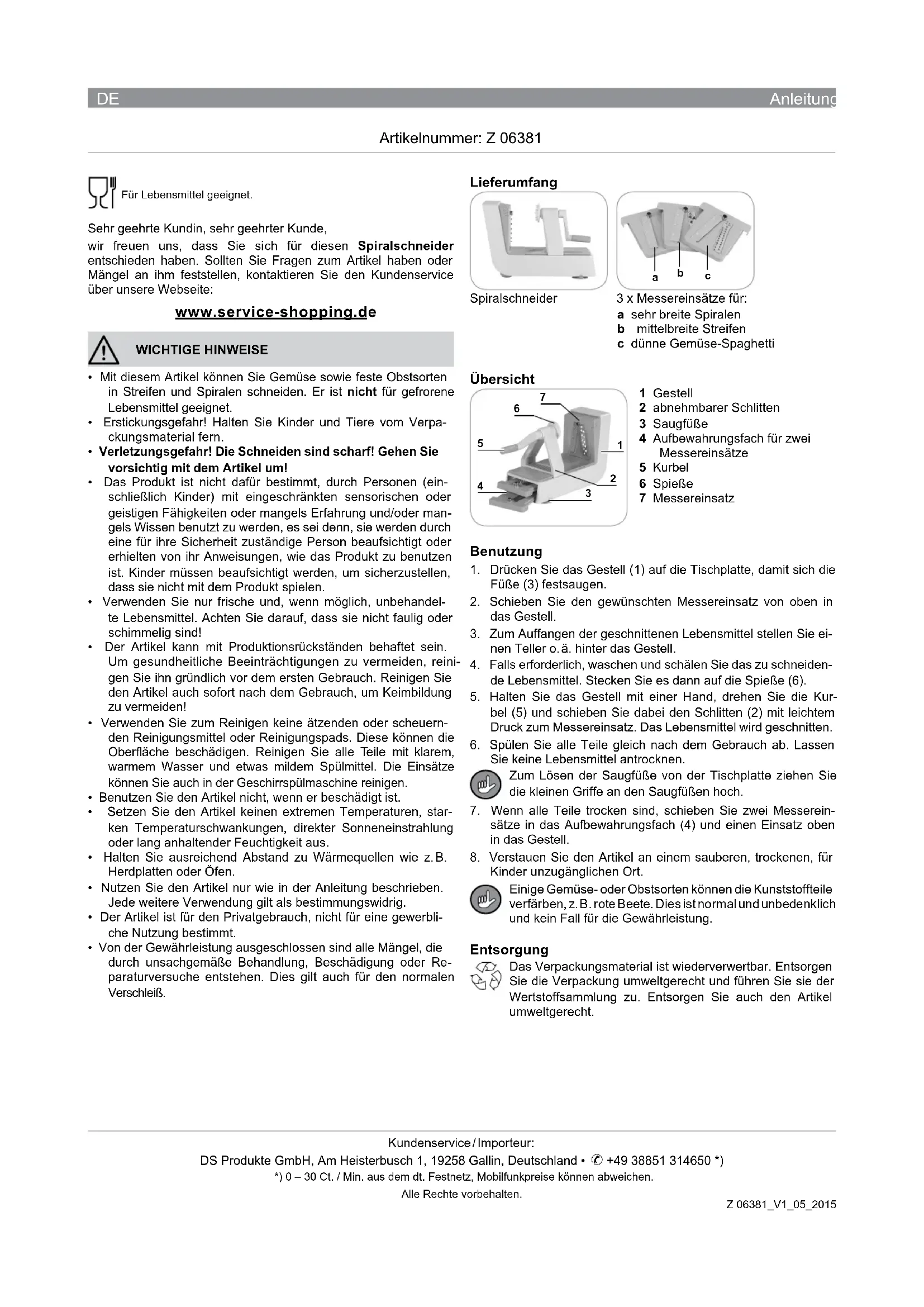 enfants. Certaines sortes de fruits ou de légumes, par ex. les betteraves rouges, peuvent colorer les pièces en matière plastique. Cela est normal et inoffensif et ne constitue pas un motif de réclamation. Mise au rebut Les matériaux d’emballage sont recyclables. Débarrassez- vous de l’emballage dans le respect de l’environnement en le déposant à un point de collecte prévu à cet effet. Éliminez également cet article conformément aux prescriptions pour la protection de l'environnement. Z 06381_V1_05_2015NL Handleiding Klantenservice/importeur: DS Produkte GmbH, Am Heisterbusch 1, 19258 Gallin, Duitsland • ✆ +49 38851 314650 *) *) Niet gratis. Alle rechten voorbehouden. Artikelnummer: Z 06381 Geschikt voor levensmiddelen. Geachte klant, Wij zij blij dat u hebt besloten tot de aanschaf van deze spiraalsnijder. Neem bij vragen over het artikel of wanneer u schade vaststelt, contact op met de klantenservice via onze website: www.service-shopping.de BELANGRIJKE AANWIJZINGEN