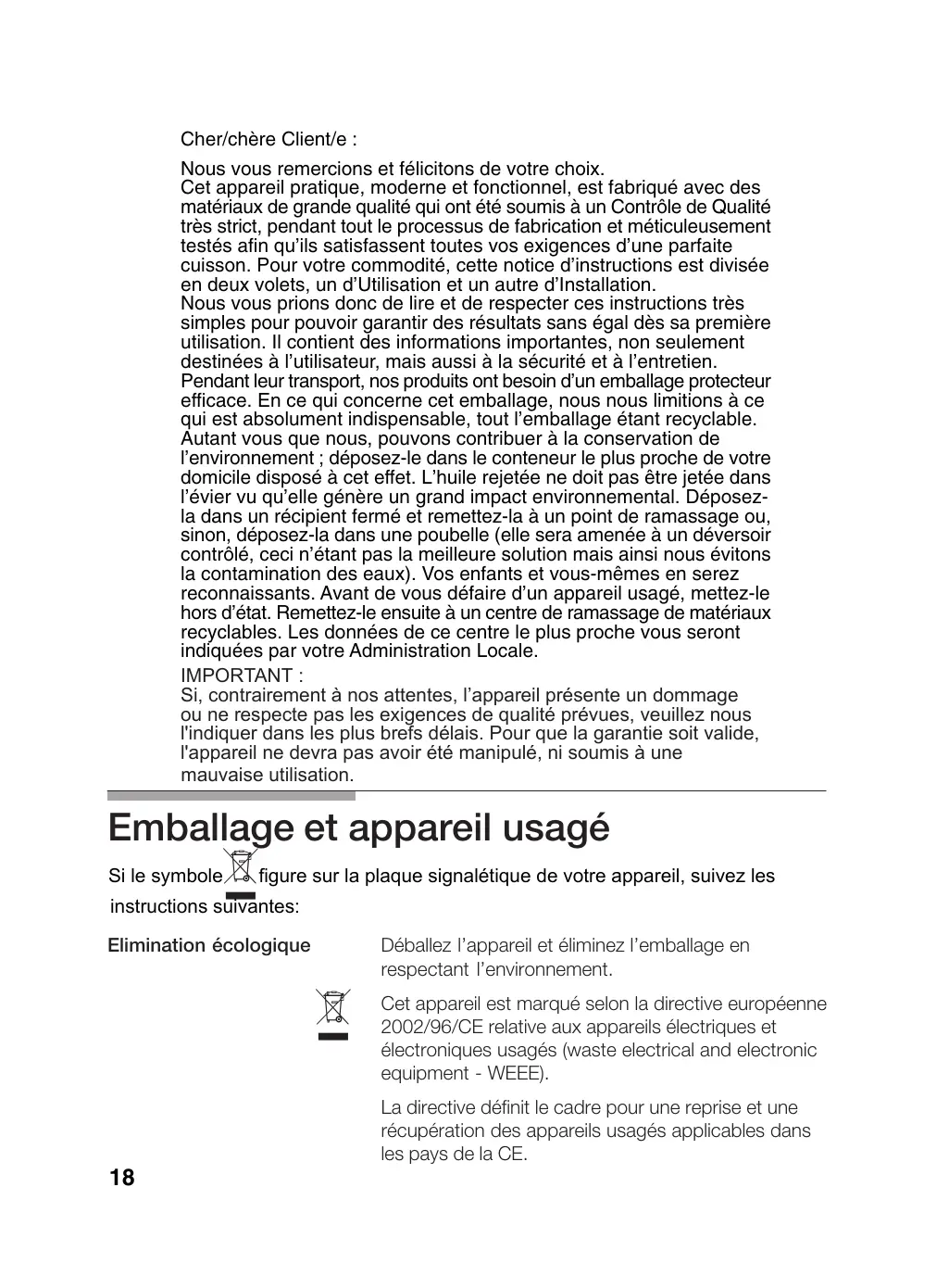 Cher/chère Client/e : Nous vous remercions et félicitons de votre choix. Cet appareil pratique, moderne et fonctionnel, est fabriqué avec des matériaux de grande qualité qui ont été soumis à un Contrôle de Qualité très strict, pendant tout le processus de fabrication et méticuleusement testés afin qu'ils satisfassent toutes vos exigences d'une parfaite cuisson. Pour votre commodité, cette notice d'instructions est divisée en deux volets, un d'Utilisation et un autre d'installation. Nous vous prions donc de lire et de respecter ces instructions très simples pour pouvoir garantir des résultats sans égal dès sa première utilisation. Il contient des informations importantes, non seulement destinées à l'utilisateur, mais aussi à la sécurité et à l'entretien. Pendant leur transport, nos produits ont besoin d'un emballage protecteur efficace. En ce qui concerne cet emballage, nous nous limitions à ce qui est absolument indispensable, tout l'emballage étant recyclable. Autant vous que nous, pouvons contribuer à la conservation de l'environnement ; déposez-le dans le conteneur le plus proche de votre domicile disposé à cet effet. L'huile rejetée ne doit pas être jetée dans l'évier vu qu'elle génère un grand impact environnemental. Déposez- la dans un récipient fermé et remettez-la à un point de ramassage ou, sinon, déposez-la dans une poubelle (elle sera amenée à un déversoir contrôlé, ceci n’étant pas la meilleure solution mais ainsi nous évitons la contamination des eaux). Vos enfants et vous-mêmes en serez reconnaissants. Avant de vous défaire d’un appareil usagé, mettez-le hors d'état. Remettez-le ensuite à un centre de ramassage de matériaux recyclables. Les données de ce centre le plus proche vous seront indiquées par votre Administration Locale. IMPORTANT : Si, contrairement à nos attentes, l'appareil présente un dommage ou ne respecte pas les exigences de qualité prévues, veuillez nous l'indiquer dans les plus brefs délais. Pour que la garantie soit valide, l'appareil ne devra pas avoir été manipulé, ni soumis à une mauvaise utilisation. Emballage et appareil usagé Si le symbole igure sur la plaque signalétique de votre appareil, suivez les