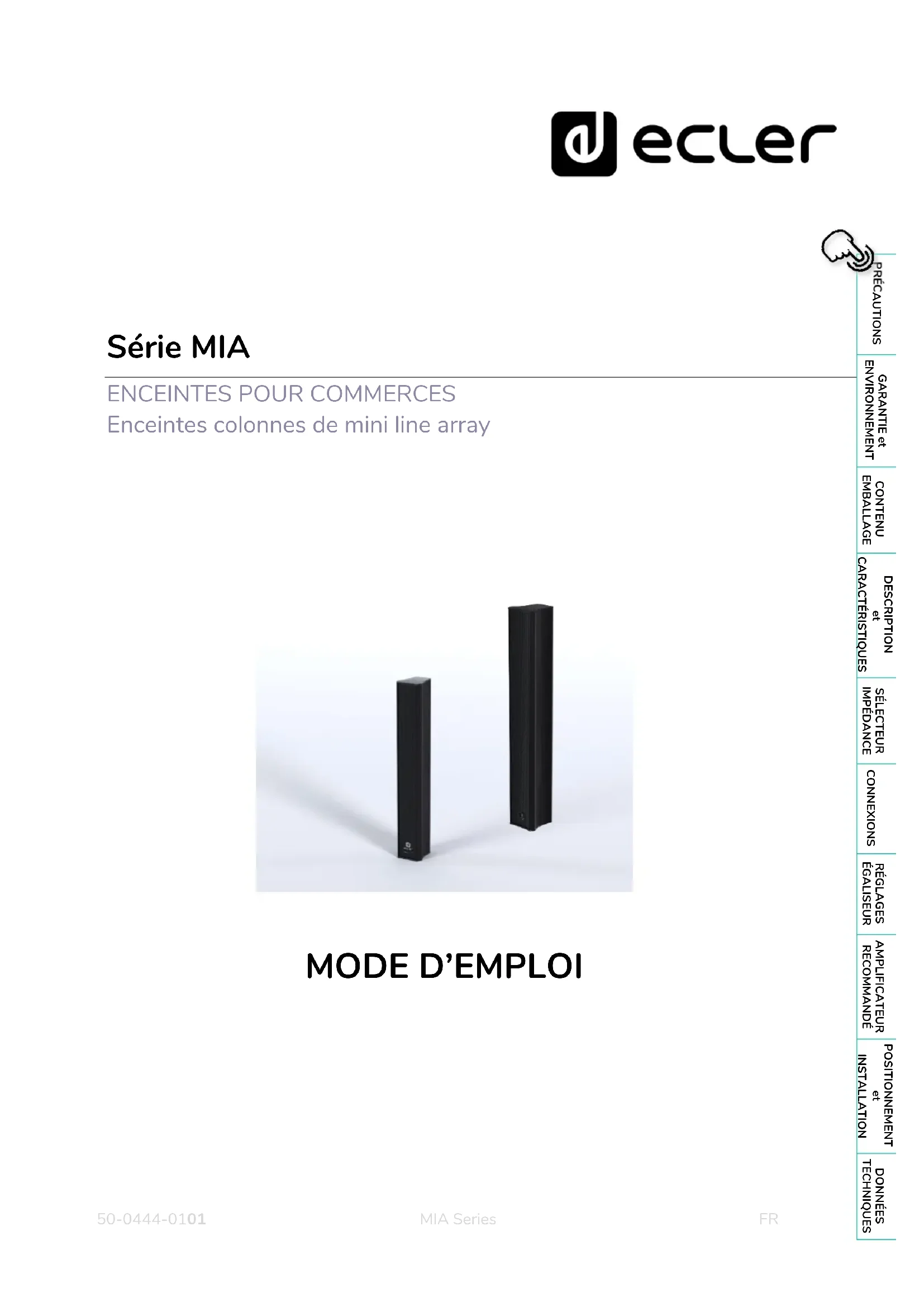 Merci d'avoir choisi notre appareil Ecler de la série MIA ! Nous apprécions votre confiance. Il est TRÈS IMPORTANT de lire attentivement ce mode d’emploi et d'en comprendre parfaitement le contenu avant d’effectuer toute connexion afin de maximiser votre utilisation et de tirer les meilleures performances de cet équipement. Pour garantir le bon fonctionnement de cet appareil, nous recommandons que sa maintenance soit assurée par nos services techniques agréés. Tous les produits ECLER bénéficient de garantie, veuillez-vous référer sur www.ecler.com ou la carte de garantie incluse avec cet appareil pour la période de validité et ses conditions. Ecler s'engage pleinement à préserver de l'environnement et l’équilibre de la planète, à encourager les économies d'énergie et à réduire les émissions de CO