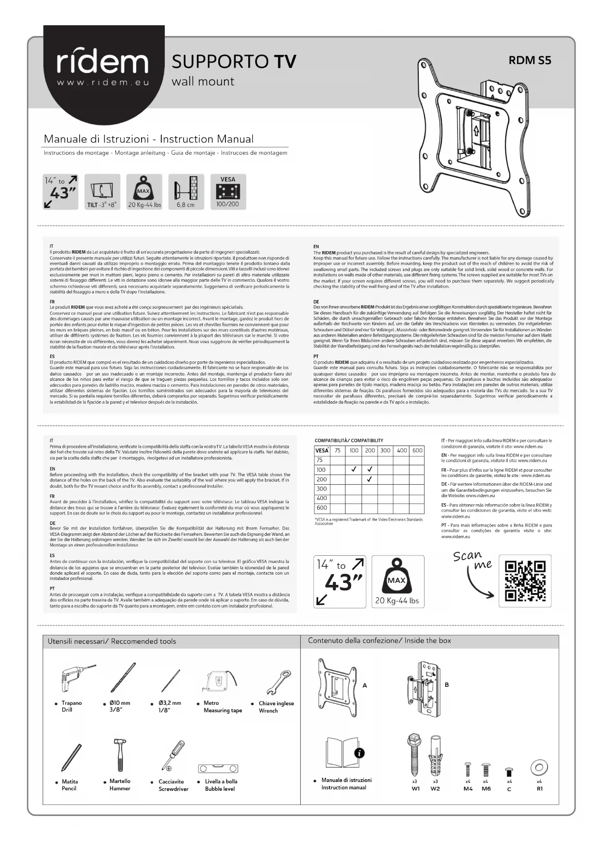 Le produit RIDEM que vous avez acheté a été conçu soigneusement par des ingénieurs spécialisés. Conservez ce manuel pour une utilisation future. Suivez attentivement les instructions. Le fabricant n'est pas responsable des dommages causés par une mauvaise utilisation ou un montage incorrect. Avant le montage, gardez le produit hors de portée des enfants pour éviter le risque d'ingestion de petites pièces. Les vis et chevilles fournies ne conviennent que pour les murs en briques pleines, en bois massif ou en béton. Pour les installations sur des murs constitués d'autres matériaux, utiliser de diérents systèmes de xation. Les vis fournies conviennent à la plupart des téléviseurs sur le marché. Si votre écran nécessite de vis diérentes, vous devrez les acheter séparément. Nous vous suggérons de vérier périodiquement la stabilité de la xation murale et du téléviseur après l'installation.