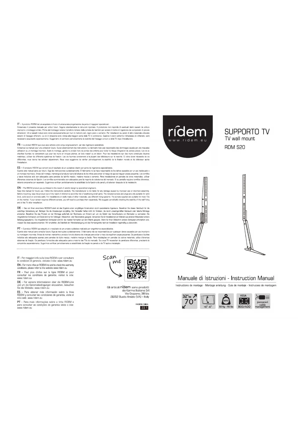 RDM S20 - Support mural Ridem - Notice d'utilisation et mode d'emploi gratuit