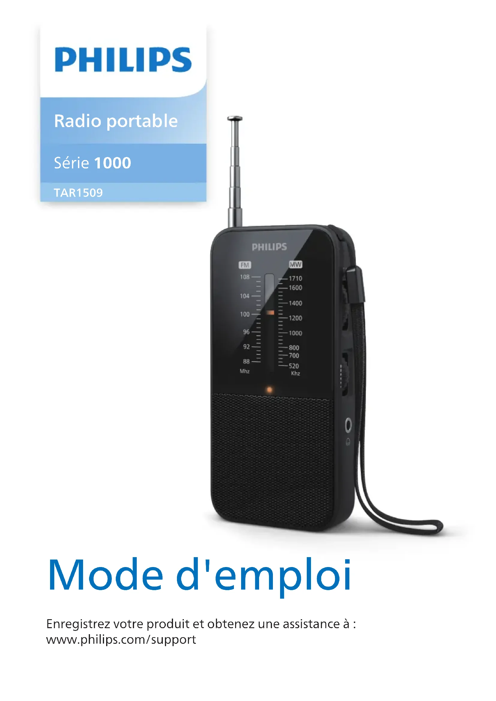 Radio portable Série 1000 TAR1509 Mode d'emploi Enregistrez votre produit et obtenez une assistance à: www.philips.com/support1FR Table des matières 1 Important 2 Sécurité 2 Sécurité de l’audition 2 Avis 3 2 Votre radio portable 4 Introduction 4 Contenu de la boîte 4 Vue d'ensemble de la radio portable 4 3 Démarrage 5 Installation des piles 5 4 Écouter la radio FM/MW 5 Syntonisez les stations de radio 5 Réglage du volume 5 Connexion à un casque 5 5 Informations du produit 6 6 Résolution des problèmes 6FR2 1 Important Sécurité