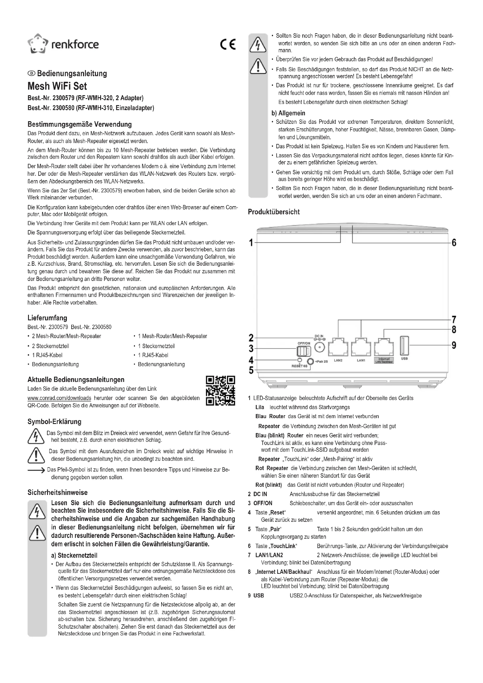 - Use a dry, lint-free cloth to clean the product. Disposal Electrical and electronic equipment does not belong in the regular household waste. Once the product becomes unusable, dispose of it in accordance with the relevant statutory regulations. Declaration of Conformity (DOC) We, Conrad Electronic SE, Klaus-Conrad-Straße 1, D-92240 Hirschau, hereby declare that this product conforms to the 2014/53/EU directive. The full text of the EU conformity declaration is available at the following Internet address: www.conrad.com/downloads Select a language by clicking a ag symbol and enter the order number of the prod- uct in the search eld; then you will be able to download the EU declaration of conformity in PDF format. Technical data a) Product Operating voltage ........................ 12 V/DC 1.5 A Power consumption ..................... max. 1.5 A Ports ............................................ 3x RJ45 10/100/1000 MBit/s, 1x WAN, 2x LAN; 1x USB Number of antennas .................... 6; 4x 5 GHz, 2x 2.4 GHz WLAN .......................................... EEE802.11b/g/n, 2.4 GHz, max. 300 MBit/s; ...................................................... IEEE802.11a/n/ac, 5 GHz, max. 1733 Mbit/s; Frequency range/ ........................ 2.412 – 2.472 GHz, ≤ 13 dBm; transmitting capacity .................... 5.150 – 5.250 GHz, ≤ 21 dBm ...................................................... 5.725 – 5.850 GHz, ≤ 14 dBm Encryption protocols .................... WPA2; WPA Modes of operation ...................... Mesh-Router/Mesh-Repeater Dimensions (W x H x D) .............. approx. 134 x 116 x 125 mm Weight ......................................... approx. 829 g per device Operating conditions .................... 0 to +40 °C / 10 - 90% rel. humidity (noncondensing) Storage conditions ....................... -10 to +70 °C / 10 - 90% rel. humidity (noncondensing) b) AC adapter Operating voltage ........................ 100 - 240 V/AC, 50/60 Hz, max. 0.5 A Output .......................................... 12 V/DC, 1,5 A, 18 W Output jack .................................. coaxial connector 5.5 x 2.5 mm This is a publication by Conrad Electronic SE, Klaus-Conrad-Str. 1, D-92240 Hirschau (www.conrad.com). All rights including translation reserved. Reproduction by any method, e.g. photocopy, microlming, or the capture in electronic data processing systems require the prior written approval by the editor. Reprinting, also in part, is prohibited. This publication represent the technical status at the time of printing. Copyright 2021 by Conrad Electronic SE. *2300579_80_V2_0421_m_DM_4LMode d’emploi Set réseau maillé Wi N° de commande 2300579 (adapteur RF-WMH-320, 2) N° de commande 2300580 (adapteur simple RF-WMH-310) Utilisation conforme Le produit sert à construire un réseau maillé. Chaque appareil peut être utilisé aussi bien comme comme routeur de réseau maillé que comme répétiteur. Le routeur de réseau maillé permet d’exploiter jusqu’à 10 répétiteurs de réseau maillé. La con- nexion entre le routeur et les répétiteurs a lieu aussi bien sans l qu’à travers câble. Le routeur de réseau maillé établit entre autres une connexion à internet à travers votre mo- dem existant. Le ou les répétiteurs de réseau maillé renforcent le réseau WLAN du routeur ou élargissent la zone de couverture du réseau WLAN. Si vous avez acheté le 2ème set (n° de commande 2300579), les deux appareils déjà con- nectés depuis l’usine. La conguration peut survenir par câble ou sans l via un navigateur internet sur un ordinateur, Mac ou dispositif mobile. La connexion de vos appareils avec le produit peut survenir via WLAN ou LAN. L’alimentation électrique s’effectue par le bloc d’alimentation fourni. Pour des raisons de sécurité et d’homologation, vous ne devez ni modier ni transformer ce produit. Si le produit est utilisé à d’autres ns que celles décrites ci-dessus, il risque d’être endommagé. En outre, une utilisation incorrecte peut générer des risques comme par ex. un court-circuit, un incendie, un choc électrique, etc. Lisez attentivement le mode d’emploi, conservez-le. Ne transmettez l’appareil à des tiers qu’avec le mode d’emploi inclus. Le produit est conforme aux exigences légales nationales et européennes. Tous les noms d’entreprise et désignations de produits sont des marques déposées de leurs propriétaires respectifs. Tous droits réservés. Contenu de la livraison N° de commande 2300579 N° de commande 2300580
