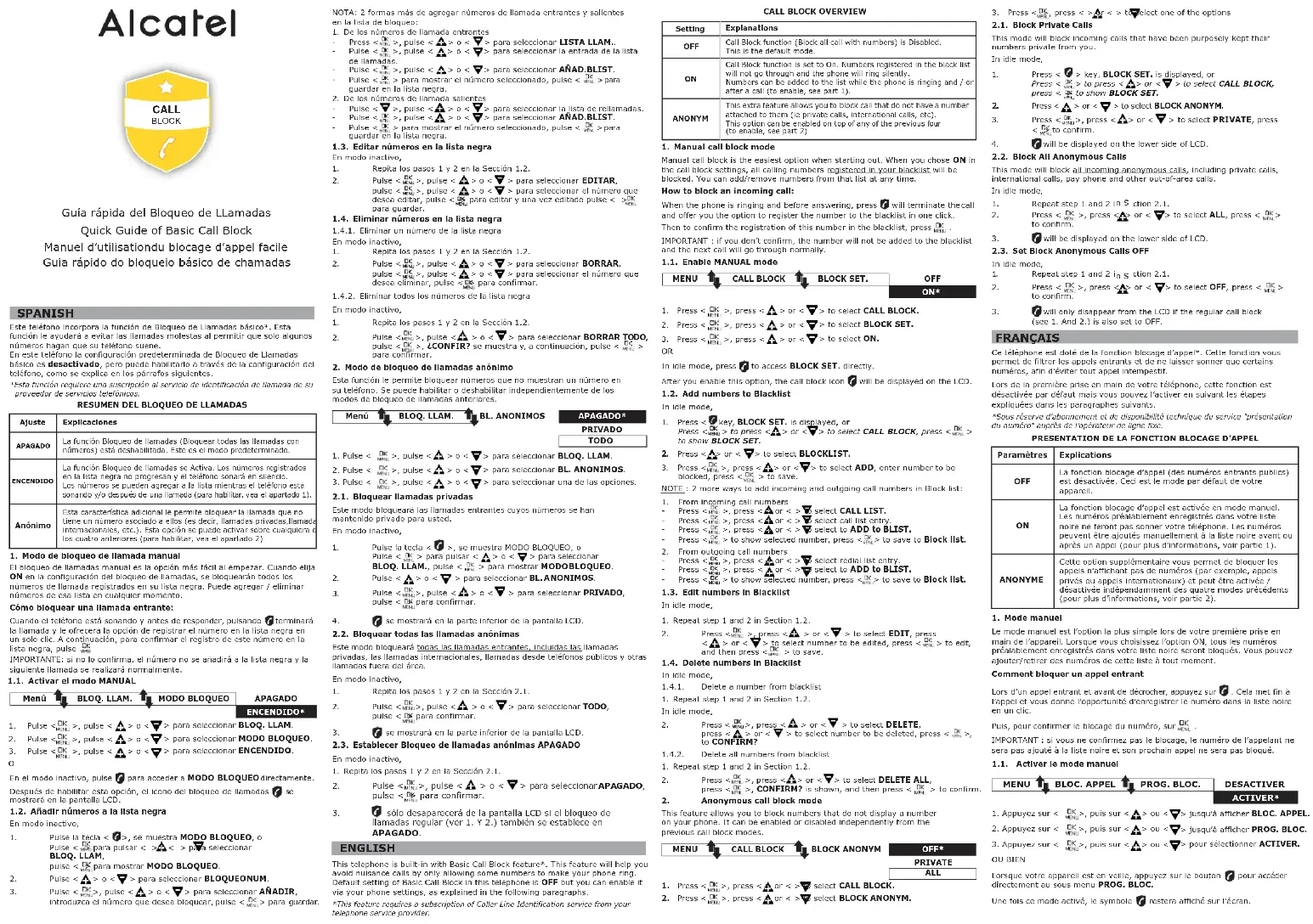 (see 1. And 2.) is also set to OFF. FRANÇAIS Ce téléphone est doté de la fonction blocage d’appel*. Cette fonction vous permet de filtrer les appels entrants et de ne laisser sonner que certains numéros, afin d’éviter tout appel intempestif. Lors de la première prise en main de votre téléphone, cette fonction est désactivée par défaut mais vous pouvez l’activer en suivant les étapes expliquées dans les paragraphes suivants. *Sous réserve d’abonnement et de disponibilité technique du service "présentation du numéro" auprès de l’opérateur de ligne fixe. PRESENTATION DE LA FONCTION BLOCAGE D’APPEL Paramètres Explications