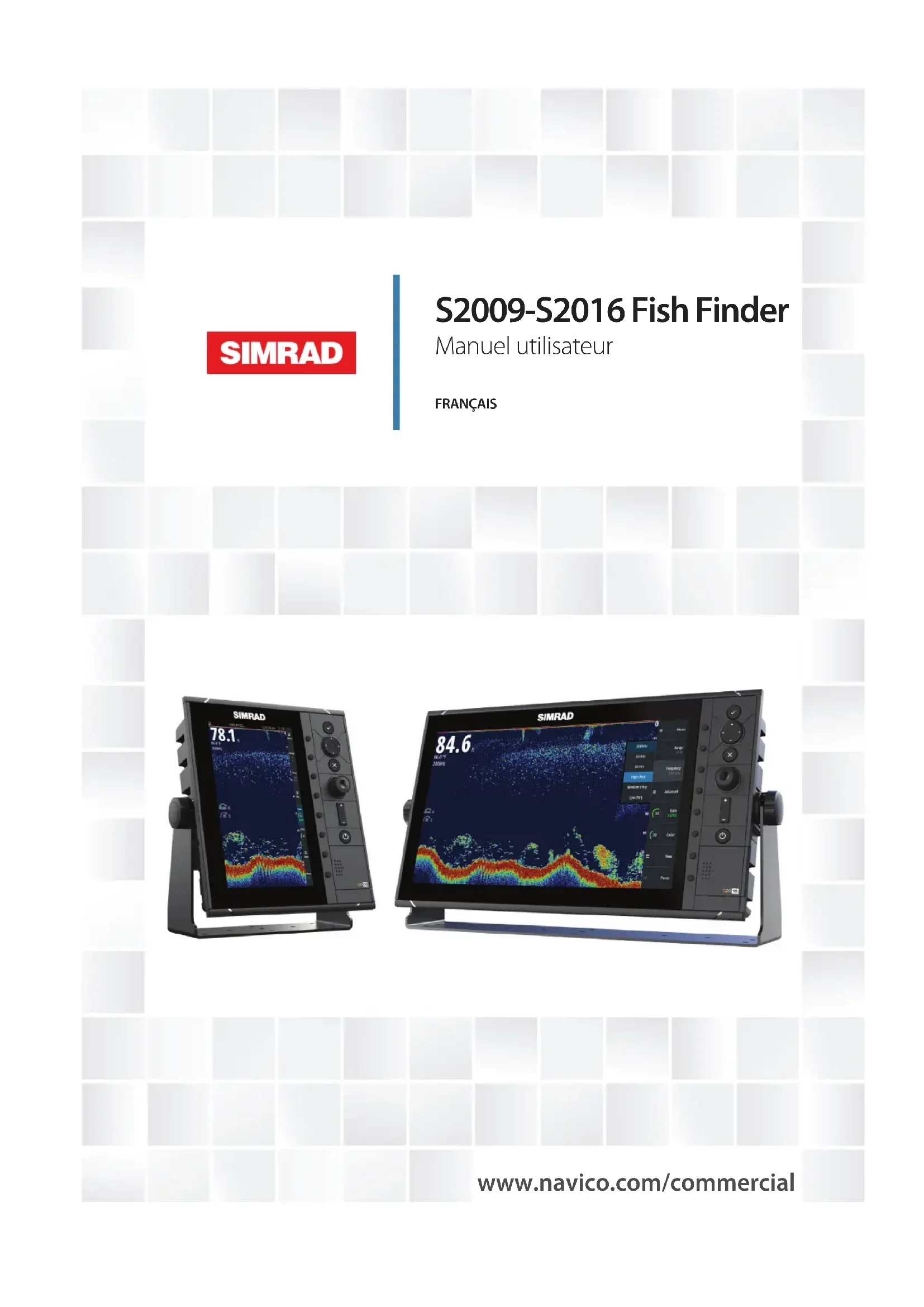 FRANÇAIS S2009-S2016 Fish Finder Manuel utilisateur www.navico.com/commercialPréface Clause de non-responsabilité Comme Navico améliore continuellement ce produit, nous nous réservons le droit d'y apporter des modifications, sans que pour autant celles-ci soient indiquées dans la présente version du manuel. Pour toute information complémentaire, veuillez consulter votre distributeur. Le propriétaire est le seul responsable de l'installation et de l'utilisation du matériel et doit s'assurer qu'il ne provoque pas d'accidents, de blessures ou de dommages matériels. L'utilisateur de ce produit est l'unique responsable du respect des règles de sécurité maritime. NAVICO HOLDING AS. ET SES FILIALES, SUCCURSALES ET SOCIÉTÉS AFFILIÉES REJETTENT TOUTE RESPONSABILITÉ EN CAS DE MAUVAISE UTILISATION DE CE PRODUIT QUI SERAIT SUSCEPTIBLE DE PROVOQUER DES ACCIDENTS OU DES DOMMAGES, OU D'ENFREINDRE LA LOI. Le présent manuel décrit la version du produit en cours au moment où ce document a été imprimé. Navico Holding AS. et ses filiales, succursales et sociétés affiliées se réservent le droit de modifier les spécifications sans préavis. Langue gouvernante la présente déclaration, les manuels d'instructions, les modes d'emploi et toute autre information relative au produit (la documentation) pourraient être traduits ou ont été traduits à partir d'une autre langue (Traduction). Dans le cas de conflits entre une traduction quelconque de la Documentation, la version anglaise de la Documentation sera la seule version officielle de la Documentation. Copyright Copyright © 2016 Navico Holding AS. Garantie Le contrat de garantie est un document fourni indépendamment de cette notice. Il est disponible à l'adresse suivante : www.navico-commercial.com. Dispositions réglementaires Cet équipement est prévu pour être utilisé dans les eaux internationales et dans les zones maritimes côtières administrées par les pays membres, conformément aux conventions internationales. Cet équipement est conforme : Cet équipement est conforme :