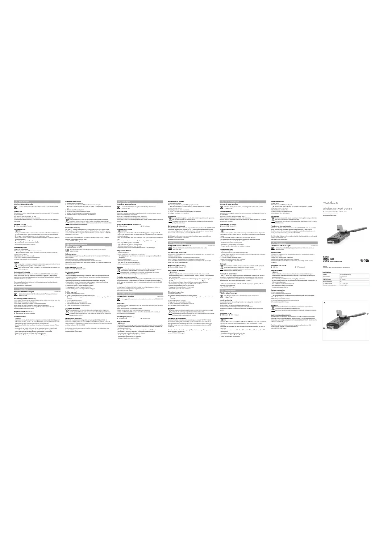 - Ne pas utiliser le produit si une pièce est endommagée ou défectueuse. Remplacez immédiatement un produit endommagé ou défectueux.• Ne pas laisser tomber le produit et éviter de le cogner.• Ne pas exposer le produit à l'eau ou à l'humidité.• Déconnectez le produit avant de procéder au nettoyage.Installer le produit1. Mettez votre ordinateur en marche.2. Insérez le produit dans un port USB de votre ordinateur. 4Une fenêtre contextuelle apparaît sur votre ordinateur pour indiquer que le produit est connecté.3. Ouvrez l’explorateur Windows.4. Double-cliquez sur le lecteur du produit.5. Suivez les instructions de l’assistant d’installation.6. Connectez votre ordinateur à un réseau Wi-Fi.Traitement des déchetsLe produit doit être jeté séparément des ordures ménagères dans un point de collecte approprié. Ne jetez pas le produit avec les ordures ménagères ordinaires.Pour plus d’informations, contactez le distributeur ou l’autorité locale responsable de la gestion des déchets.Déclaration de conformitéNous, Nedis B.V., déclarons en tant que fabricant que le produit WSNWA5410BK de notre marque Nedis®, produit en Chine, a été testé conformément à toutes les normes et réglementations CE en vigueur et que tous les tests ont été réussis. Cela inclut, sans toutefois s'y limiter, la directive RED 2014/53/UE.La Déclaration de conformité complète (et la che de sécurité le cas échéant) peut être trouvée et téléchargée via :nedis.fr/WSNWA5410BK #support Guia de iniciação rápida Dongle de rede sem fios WSNWA5410BK Para mais informações, consulte a versão alargada do manual on-line: ned.is/WSNWA5410BK Utilização previstaEste produto é um dongle de rede sem os destinado a receber uma ligação Wi-Fi estável no seu computador.Este produto destina-se apenas a utilização interior.Utilize o produto apenas conforme descrito neste documento.Qualquer alteração do produto pode ter consequências em termos de segurança, garantia e funcionamento adequado.Peças principais (imagem A)1 Conetor USB 2 Recetor Wi-FiInstruções de segurança -AVISO