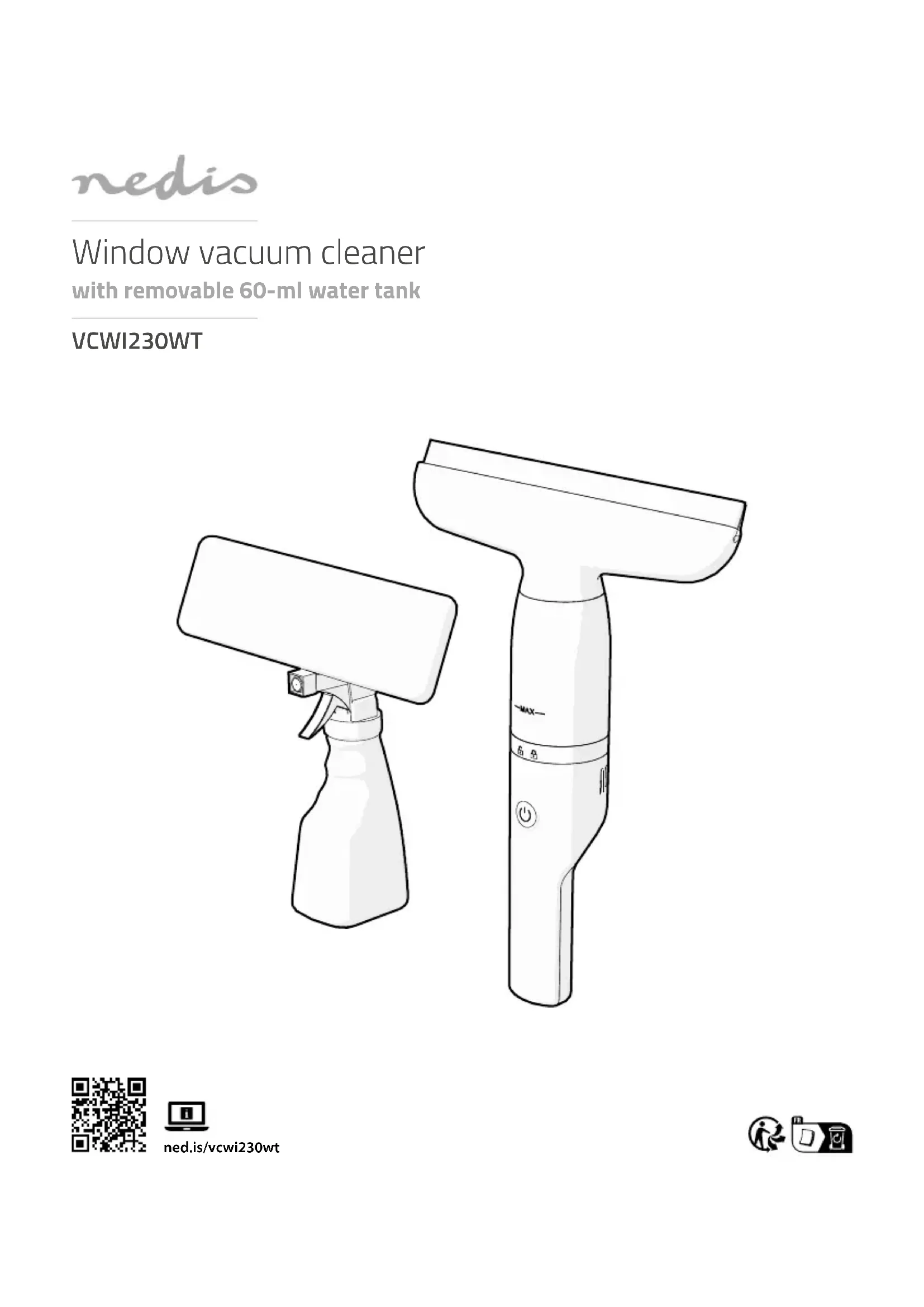 Guide de démarrage rapide Aspirateur de fenêtre VCWI230WTPour plus d'informations, consultez le manuel détaillé en ligne : ned.is/vcwi230wt Utilisation prévue Ce produit est un aspirateur de vitres pour le nettoyage et le séchage des vitres et des surfaces lisses.Le produit n'est pas destiné à nettoyer les surfaces rugueuses.Toute modication du produit peut avoir des conséquences sur la sécurité, la garantie et le bon fonctionnement.Le produit n’est pas destiné à un usage professionnel.Ce produit peut être utilisé par des enfants âgés de 8 ans et plus ainsi que des personnes ayant des capacités physiques, sensorielles ou mentales réduites ou manquant d’expérience et de connaissances s’ils sont supervisés ou ont reçu des instructions sur l’utilisation du produit en toute sécurité et comprennent les dangers impliqués. Les enfants ne doivent pas jouer avec le produit. Le nettoyage et la maintenance ne doivent pas être eectués par des enfants sans surveillance.Ce produit est destiné à être utilisé dans des environnements domestiques pour des fonctions de ménage typiques qui peuvent également être réalisées par des utilisateurs non experts pour des fonctions de ménage typiques, tels que : des magasins, bureaux, autres environnements de travail similaires, fermes, par des clients dans des hôtels, motels et autres environnements de type résidentiel et/ou dans des environnements de type chambres d'hôtes. Pièces principales (image A) 1 Chion en microbre2 Buse de pulvérisation3 Flacon pulvérisateur4 Buse d'essuyage / d'aspiration5 Récipient à eau7 Kinderen mogen niet met het product spelen. De reiniging en het onderhoud door de gebruiker mogen niet worden uitgevoerd door kinderen zonder toezicht.Dit product is bedoeld voor gebruik in huishoudelijke omgevingen voor typische huishoudelijke functies die ook kunnen worden gebruikt door niet-deskundige gebruikers voor typische huishoudelijke functies, zoals: winkels, kantoren en andere soortgelijke werkomgevingen, boerderijen, door klanten in hotels, motels en andere woonomgevingen en/of in omgevingen van het type “bed & breakfast”. Belangrijkste onderdelen (afbeelding A) 1 Microvezeldoek2 Spuitkop3 Sproeies4 Wisser/zuigmond5 Waterreservoir6 Containerplug7 Aan/uit-knop met statusindicatieled8 Vacuüm lichaam9 USB-C poortq USB-C kabel Veiligheidsvoorschriften