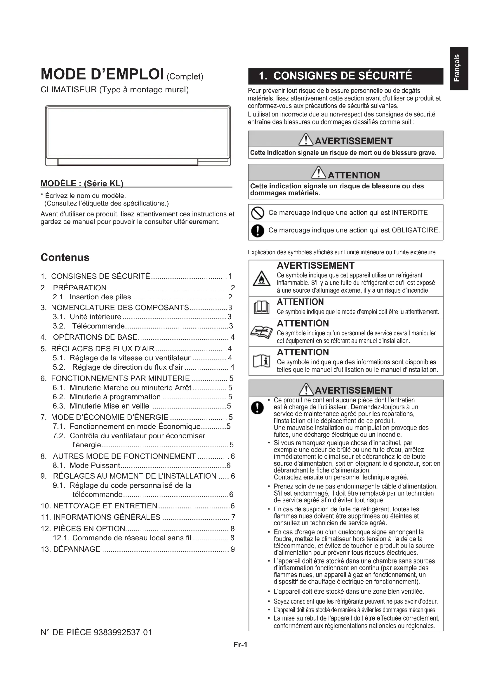 MODE D’EMPLOI (Complet) CLIMATISEUR (Type à montage mural) MODÈLE : (Série KL)