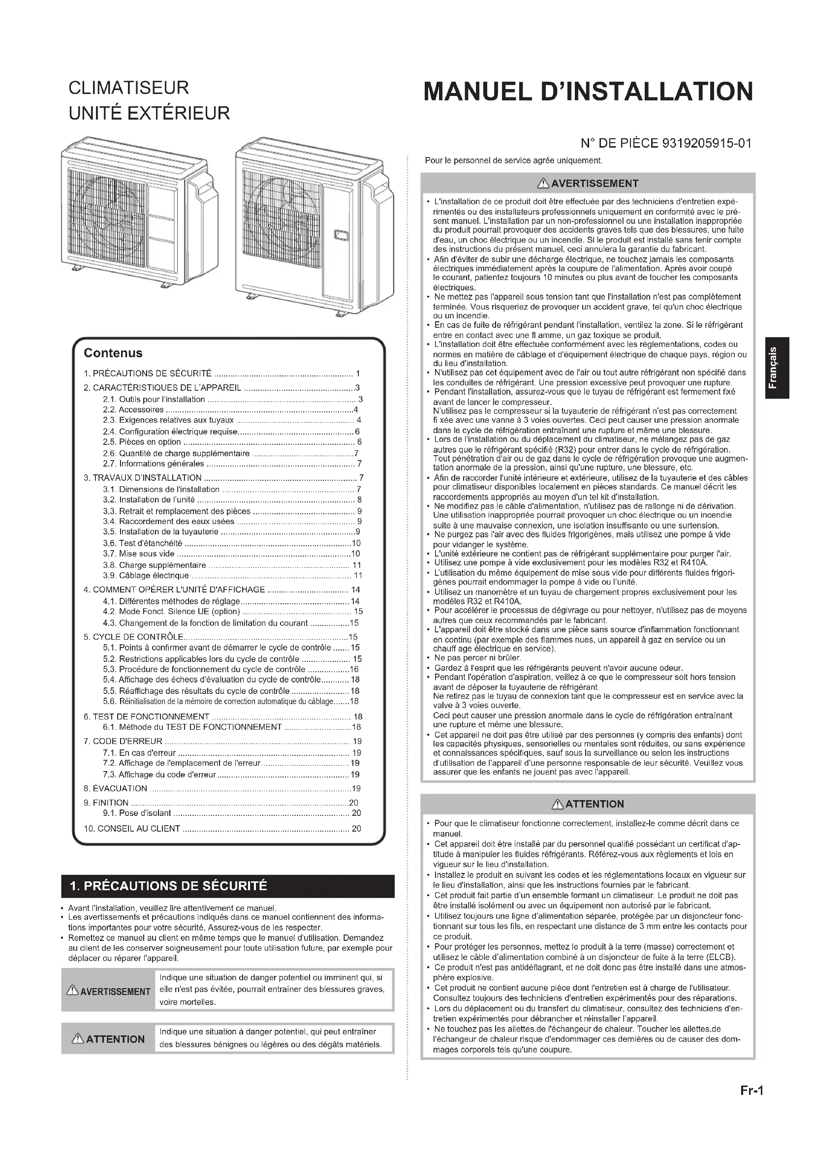 - Remettez ce manuel au client en même temps que le manuel d'utilisation. Demandez au client de les conserver soigneusement pour toute utilisation future, par exemple pour déplacer ou réparer l'appareil. AVERTISSEMENT Indique une situation de danger potentiel ou imminent qui, si elle n'est pas évitée, pourrait entraîner des blessures graves, voire mortelles. ATTENTION Indique une situation à danger potentiel, qui peut entraîner des blessures bénignes ou légères ou des dégâts matériels. Pour le personnel de service agrée uniquement. Contenus