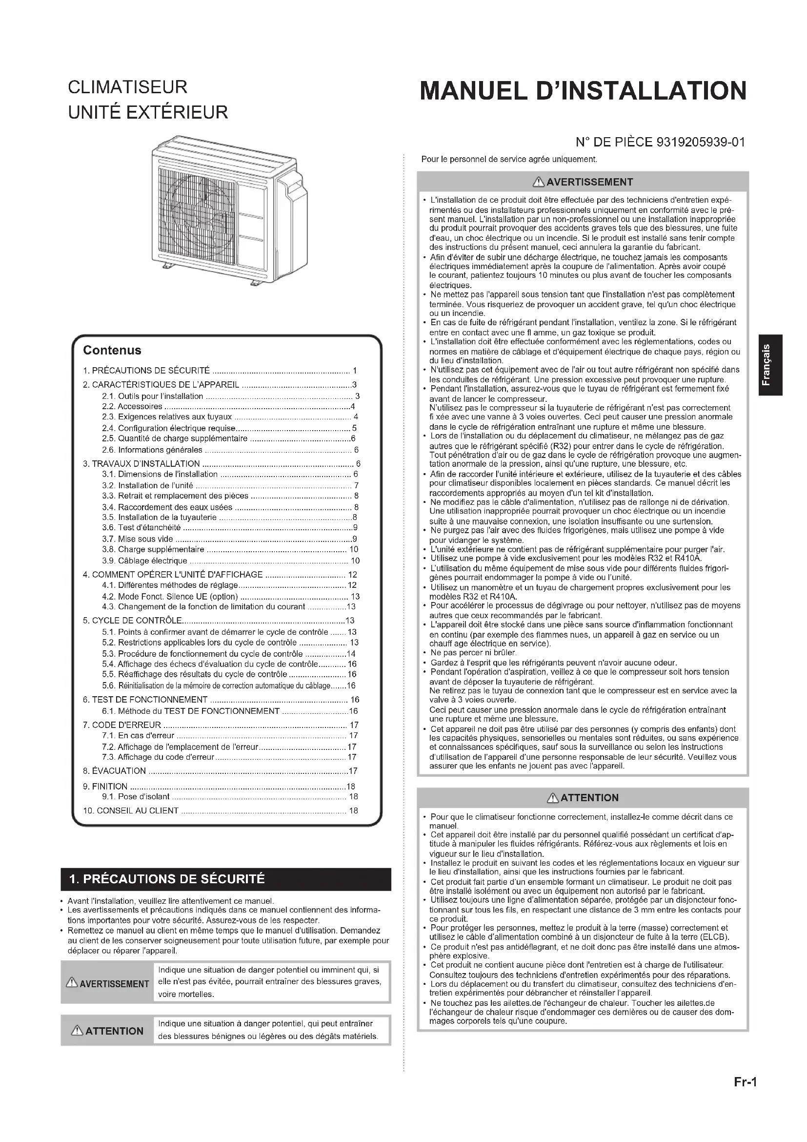 - Remettez ce manuel au client en même temps que le manuel d'utilisation. Demandez au client de les conserver soigneusement pour toute utilisation future, par exemple pour déplacer ou réparer l'appareil. AVERTISSEMENT Indique une situation de danger potentiel ou imminent qui, si elle n'est pas évitée, pourrait entraîner des blessures graves, voire mortelles. ATTENTION Indique une situation à danger potentiel, qui peut entraîner des blessures bénignes ou légères ou des dégâts matériels. Pour le personnel de service agrée uniquement. Contenus