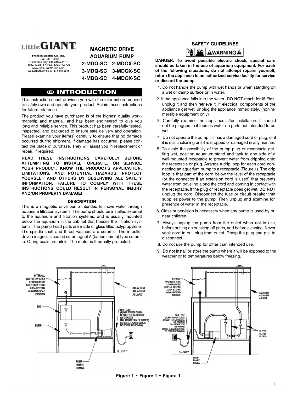 Figure 2 • Figure 2 • Figura 2DESCRIPTION La pompe que vous avez achetée est activée par magnétisme et est conçue pour produire un courant d’eau dans les systèmes de filtration des aquariums. Les pompes installées à l’extérieur de l’aquarium et du système de filtration sont souvent montées sous l’aquarium, dans le boîtier qui loge les systèmes de filtration. La tête de pompe est fabriquée en verre rempli de polypropylène. L’arbre à broche et les rondelles de butée sont en céramique. L’aimant à turbine est revêtu de céramique-métal magnétisé A (fer- rite de baryum). Les joints toriques sont en nitrile. Le moteur est protégé thermiquement.