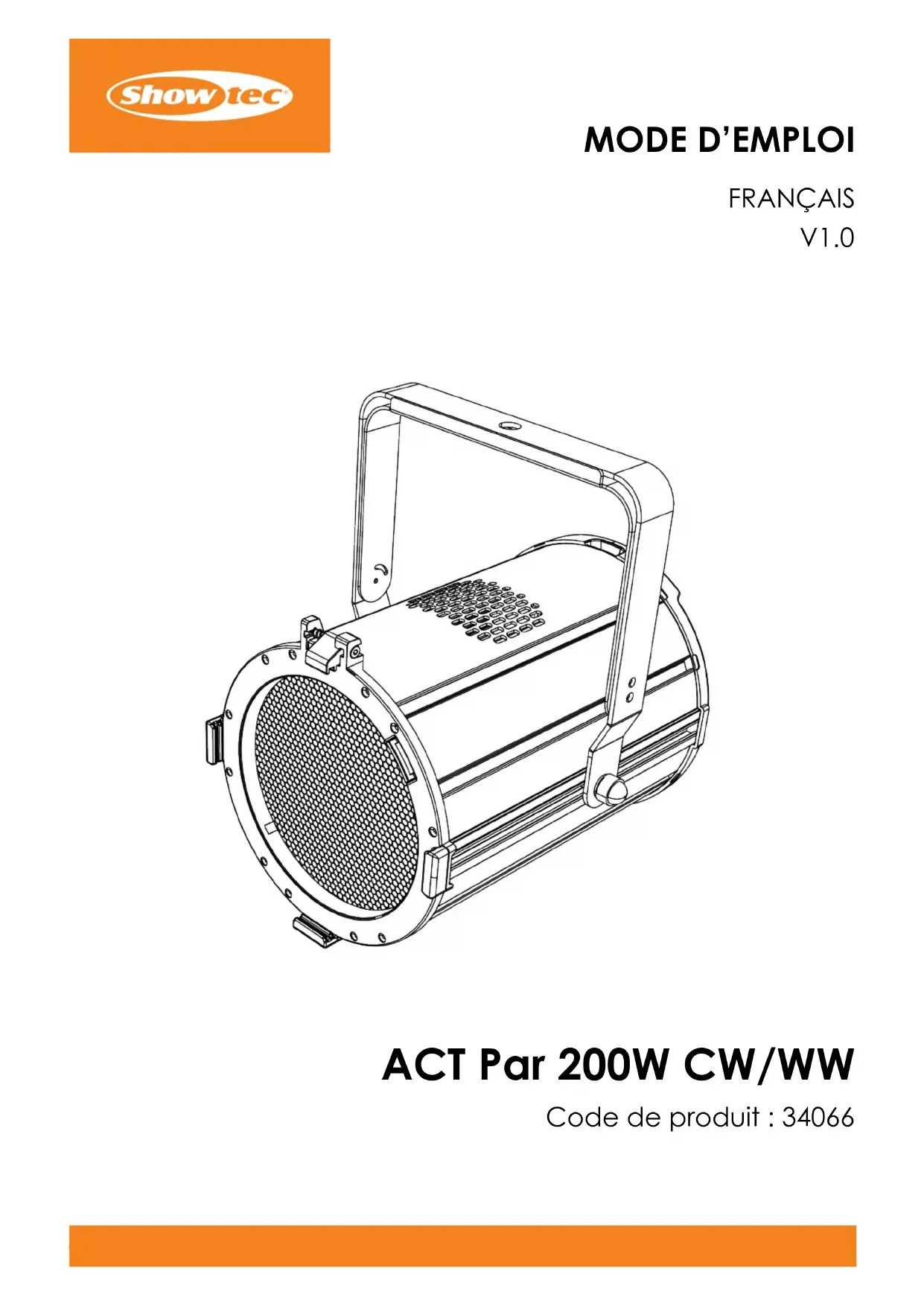 FRANÇAIS V1.0 ACT Par 200W CW/WW Code de produit : 34066 cc cPréface Nous vous remercions d’avoir fait l’acquisition de ce produit Showtec. L’objectif de ce mode d’emploi est de vous fournir des instructions pour une utilisation correcte et sûre de ce produit. Conservez le mode d’emploi pour pouvoir le consulter ultérieurement, car il fait partie intégrante du produit. Le mode d’emploi doit être conservé dans un endroit facilement accessible. Ce mode d’emploi contient des informations concernant: