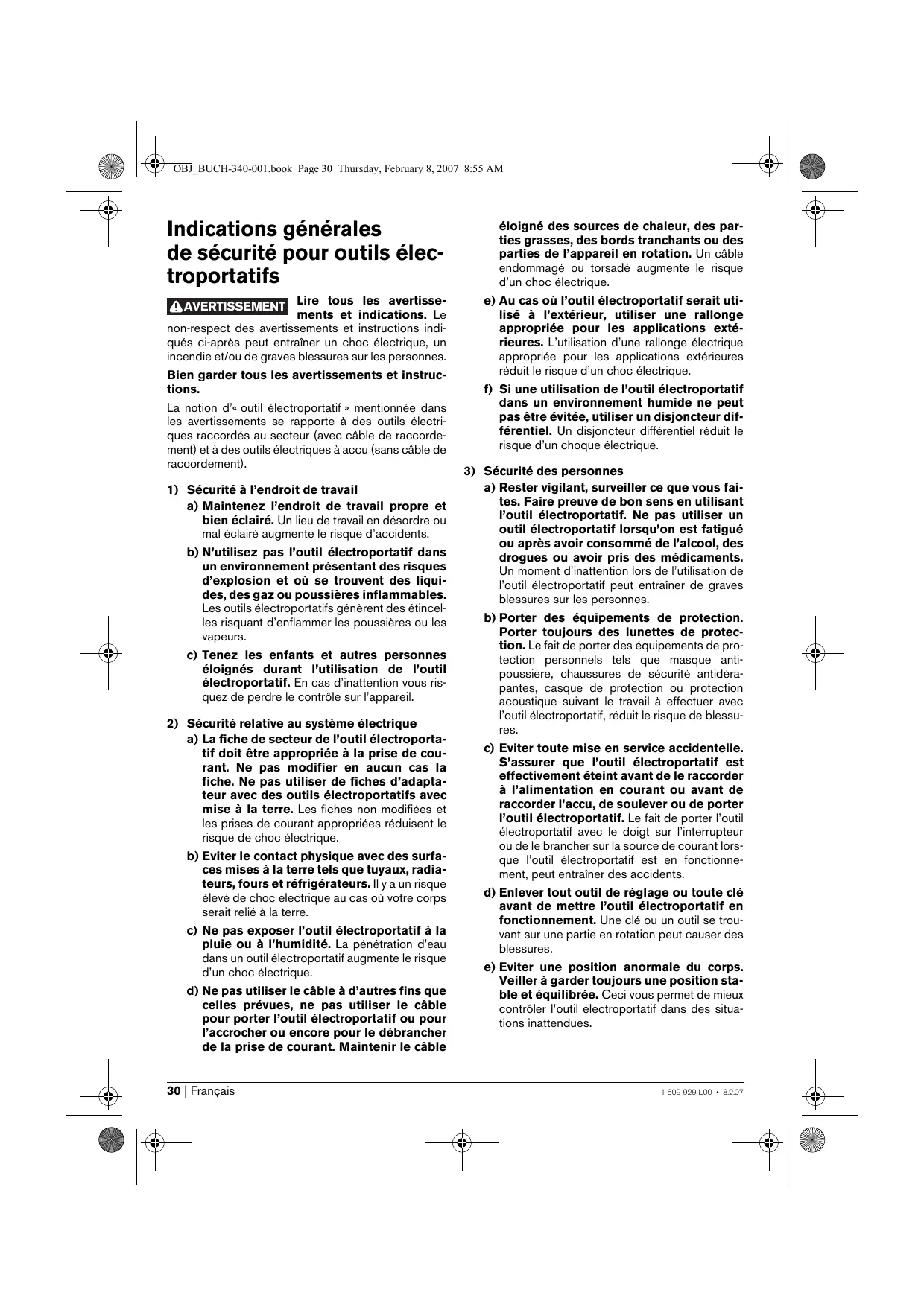 a) Rester vigilant, surveiller ce que vous faites. Faire preuve de bon sens en utilisant l’outil électroportatif. Ne pas utiliser un outil électroportatif lorsqu’on est fatigué ou après avoir consommé de l’alcool, des drogues ou avoir pris des médicaments. Un moment d’inattention lors de l’utilisation de l’outil électroportatif peut entraîner de graves blessures sur les personnes. b) Porter des équipements de protection. Porter toujours des lunettes de protection. Le fait de porter des équipements de protection personnels tels que masque antipoussière, chaussures de sécurité antidérapantes, casque de protection ou protection acoustique suivant le travail à effectuer avec l’outil électroportatif, réduit le risque de blessures. c) Eviter toute mise en service accidentelle. S’assurer que l’outil électroportatif est effectivement éteint avant de le raccorder à l’alimentation en courant ou avant de raccorder l’accu, de soulever ou de porter l’outil électroportatif. Le fait de porter l’outil électroportatif avec le doigt sur l’interrupteur ou de le brancher sur la source de courant lorsque l’outil électroportatif est en fonctionnement, peut entraîner des accidents. d) Enlever tout outil de réglage ou toute clé avant de mettre l’outil électroportatif en fonctionnement. Une clé ou un outil se trouvant sur une partie en rotation peut causer des blessures. e) Eviter une position anormale du corps. Veiller à garder toujours une position stable et équilibrée. Ceci vous permet de mieux contrôler l’outil électroportatif dans des situations inattendues. 1 609 929 L00 • 8.2.07 OBJ_BUCH-340-001.book Page 31 Thursday, February 8, 2007 8:55 AM f) Porter des vêtements appropriés. Ne pas porter de vêtements amples ni de bijoux. Maintenir cheveux, vêtements et gants éloignés des parties de l’appareil en rotation. Des vêtements amples, des bijoux ou des cheveux longs peuvent être happés par des pièces en mouvement. g) Si des dispositifs servant à aspirer ou à recueillir les poussières doivent être utilisés, vérifier que ceux-ci soient effectivement raccordés qu’ils sont correctement utilisés. L’utilisation d’un dispositif d’aspiration des poussières peut réduire les dangers dus aux poussières.
