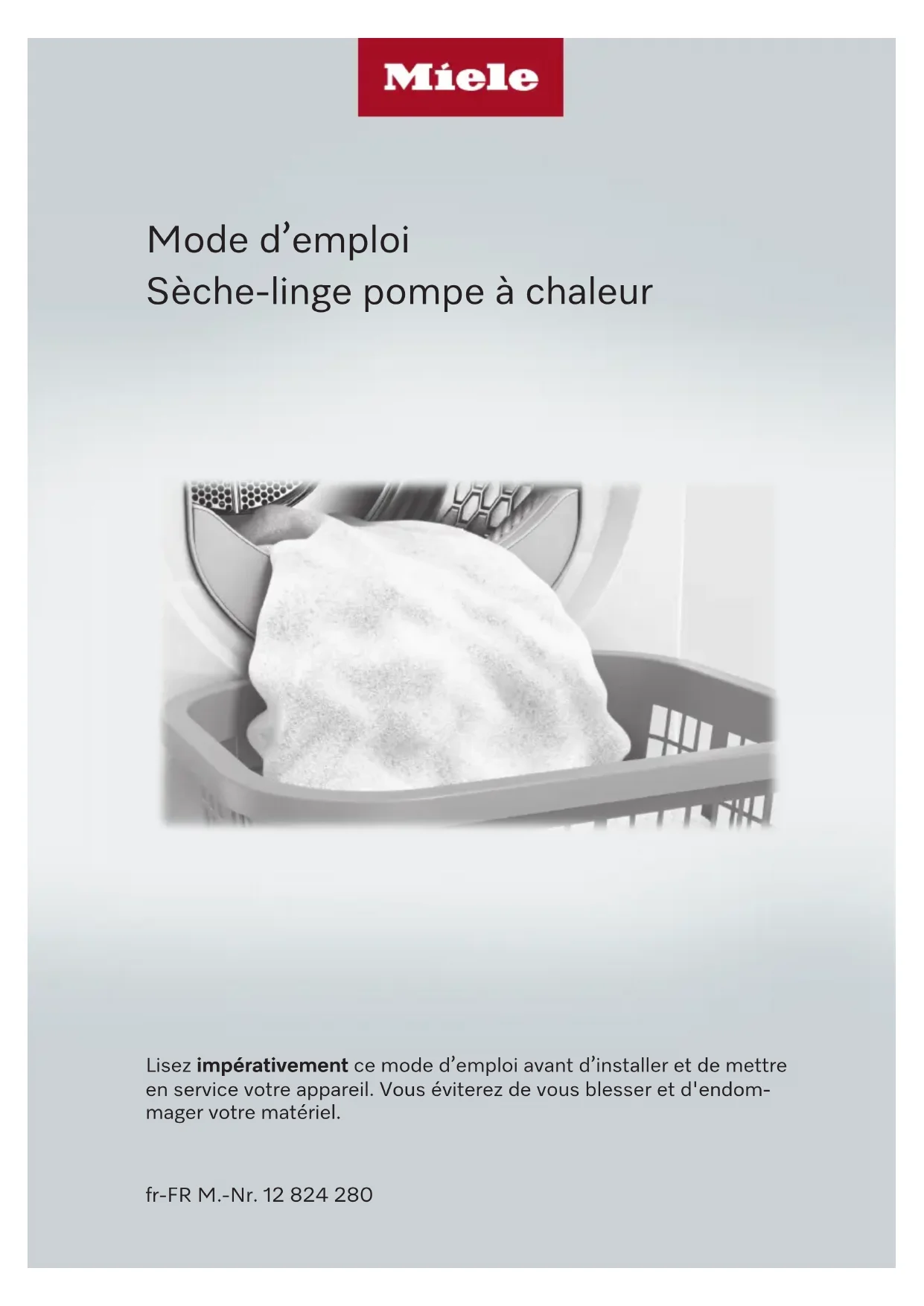 Mode d’emploi Sèche-linge pompe à chaleur Lisez impérativement ce mode d’emploi avant d’installer et de mettre en service votre appareil. Vous éviterez de vous blesser et d'endom- mager votre matériel. fr-FR M.-Nr. 12 824 280Table des matières