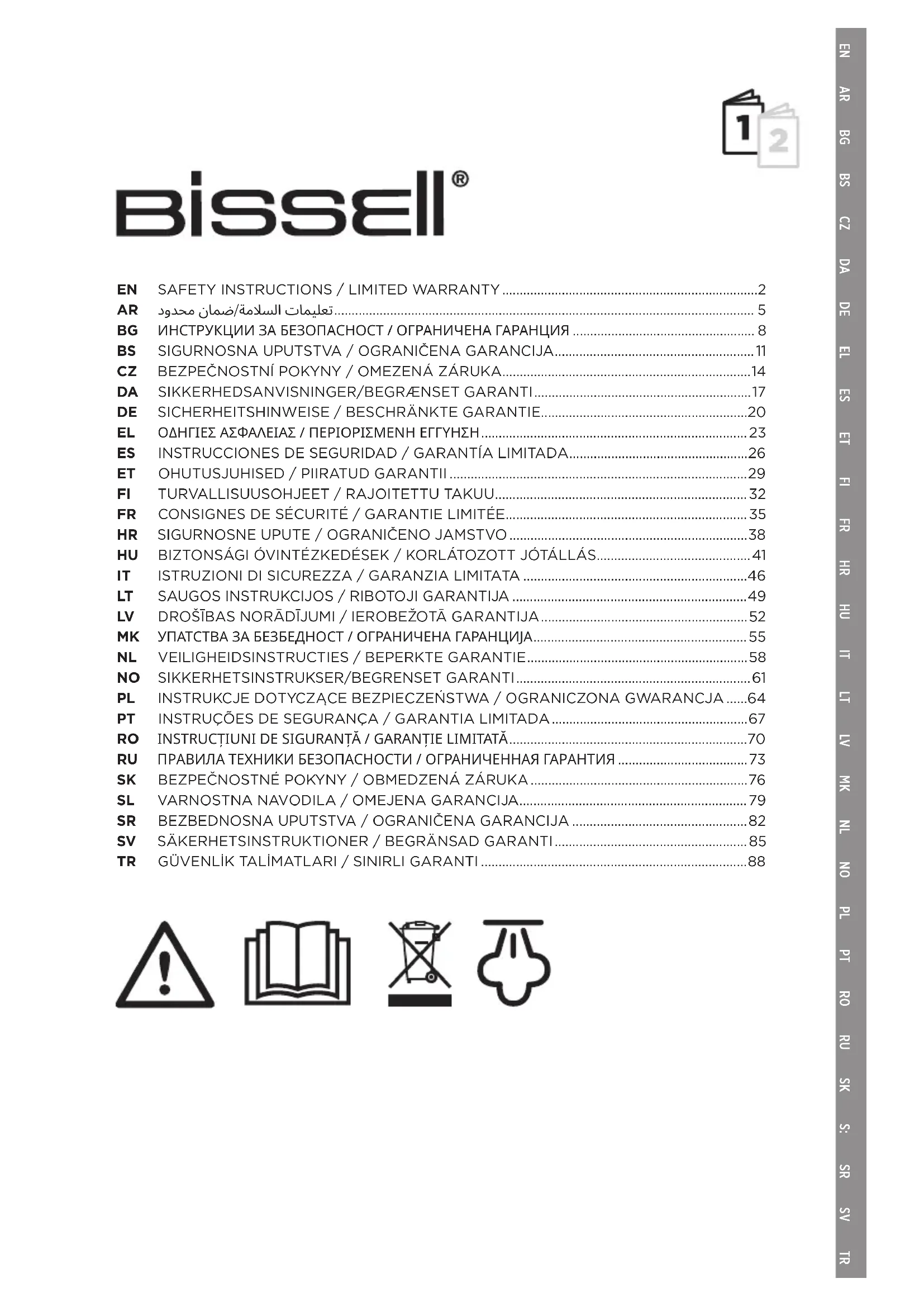 Attention, surface chaude. Si les broches des pièces de la fiche sont endommagées, le bloc d'alimentation enfichable doit être mis au rebut. Ce symbole présent sur le produit et/ou les documents l'accompagnant signifie que les produits électriques et électroniques usagés ne doivent pas être mélangés avec les déchets ménagers. Pour un traitement, une revalorisation et un recyclage adaptés, apporter ce produit aux points de collecte désignés. Contacter votre autorité locale pour savoir où se situe votre point de collecte le plus proche. Utiliser de l'eau chaude, jusqu'à 60°C. Laisser sécher les pièces. Vérifier l'étiquette du fabricant avant de nettoyer le textile. «W» sur l'étiquette, comme sur l'illustration, signifie que vous pouvez utiliser votre nettoyeur. Verrouiller. Recycler la batterie lithium-ion. Commutateur marche/veille. Peut être utilisé par les enfants de 8ans et plus. FR36 global.BISSELL.com