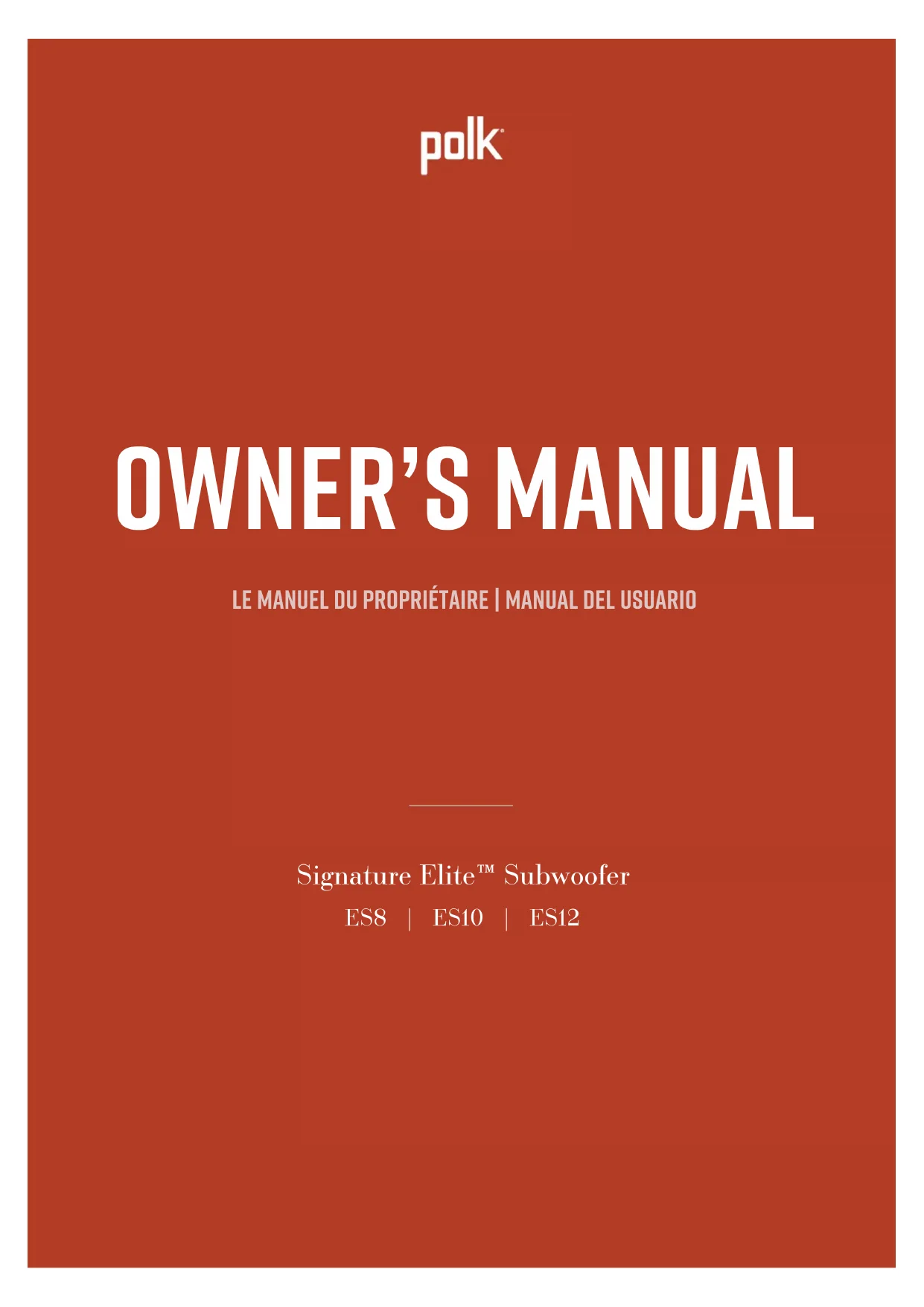 Spécifications du caisson de basses Assistance technique Si votre produit a été endommagé pendant l’expédition, veuillez contacter le revendeur agréé de Polk Audio auprès duquel vous l’avez acheté. Pour toute assistance technique, la FAQ et les modalités de réparation, rendez-vous sur le site support.polkaudio.com. Les adresses électroniques et les numéros de téléphone du service d’assistance technique varient en fonction de la région dans laquelle vous avez acheté votre produit. Type, puissance et fréquence ES8 ES10 ES12 Type de haut-parleur Caisson de basses Caisson de basses Caisson de basses Type de basse Vented with Single Internal Power Port™ Vented with Double Internal Power Port™ Vented with Double Internal Power Port™ Gamme de fréquences -3dB 32Hz - 180Hz 28Hz - 250Hz 22Hz - 250Hz Gamme de fréquences -10dB 28HZ - 400Hz 22Hz - 375Hz 18Hz - 350Hz Continu (RMS) 100W 200W 300W Type d’amplificateur Classe D Classe D Classe D Ajustement des phases -135° à +180° par incréments de 45° -135° à +180° par incréments de 45° -135° à +180° par incréments de 45° Fréquence de croisement passe- bas 50Hz-160Hz + LFE 50Hz-160Hz + LFE 50Hz-160Hz + LFE Dimensions et poids Dimensions du produit (L x H x P) 325 x 383 x 386mm 331 x 438 x 419mm 362 x 483 x 483mm Poids du produit (chacun) 13kg 17,7kg 21,6kg Armoires Pieds Installé en permanence (pas de nivellement) Installé en permanence (pas de nivellement) Installé en permanence (pas de nivellement) Contributions Niveau ligne RCA Gauche + Droite RCA Gauche + Droite RCA Gauche + Droite LFE RCA simple RCA simple RCA simple Contrôles Alimentation principale Bascule marche/arrêt Bascule marche/arrêt Bascule marche/arrêt Puissance automatique Allumage automatique/ toujours allumé Allumage automatique/ toujours allumé Allumage automatique/ toujours allumé Gagner Boutons poussoirs volume +/- Boutons poussoirs volume +/- Boutons poussoirs volume +/- Filtre passe bas Boutons poussoirs passe-bas +/- Boutons poussoirs passe-bas +/- Boutons poussoirs passe-bas +/- Phase Boutons poussoirs phase +/- Boutons poussoirs phase +/- Boutons poussoirs phase +/- Les spécifications sont sujettes à changement sans préavis.Français
