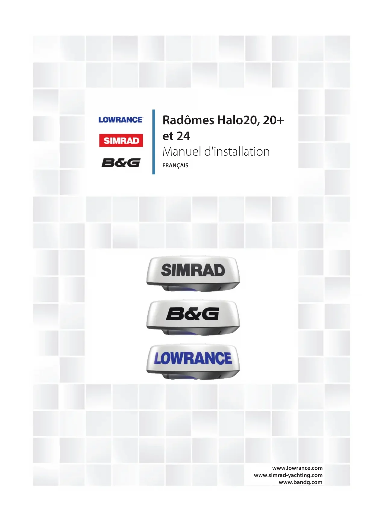 FRANÇAIS Radômes Halo20, 20+ et24 Manuel d'installation www.lowrance.com www.simrad-yachting.com www.bandg.com| 3 Préface Manuel d'installation des radômes Halo20, 20+ et24 Préface Clause de non-responsabilité Comme Navico améliore continuellement ce produit, nous nous réservons le droit d'y apporter des modifications, sans que pour autant celles-ci soient indiquées dans la présente version du manuel. Pour toute information complémentaire, veuillez consulter votre distributeur.Le propriétaire est le seul responsable de l'installation et de l'utilisation du matériel et doit s'assurer qu'il ne provoque pas d'accidents, de blessures ou de dommages matériels. L'utilisateur de ce produit est l'unique responsable du respect des règles de sécurité maritime.NAVICO HOLDING AS. ET SES FILIALES, SUCCURSALES ET SOCIÉTÉS AFFILIÉES REJETTENT TOUTE RESPONSABILITÉ EN CAS DE MAUVAISE UTILISATION DE CE PRODUIT QUI SERAIT SUSCEPTIBLE DE PROVOQUER DES ACCIDENTS OU DES DOMMAGES, OU D'ENFREINDRE LA LOI. Le présent manuel décrit la version du produit en cours au moment où ce document a été imprimé. Navico Holding AS. et ses filiales, succursales et sociétés affiliées se réservent le droit de modifier les spécifications sans préavis. Langue gouvernante la présente déclaration, les manuels d'instructions, les modes d'emploi et toute autre information relative au produit (la documentation) pourraient être traduits ou ont été traduits à partir d'une autre langue (Traduction). Dans le cas de conflits entre une traduction quelconque de la Documentation, la version anglaise de la Documentation sera la seule version officielle de la Documentation. Copyright Copyright © 2019 Navico Holding AS. Garantie Le contrat de garantie est un document fourni indépendamment de cette notice.Pour toute demande relative à la garantie, veuillez consulter le site Web concernant votre appareil :www.lowrance.comwww.simrad-yachting.comwww.bandg.com Déclaration de conformité Europe Cet appareil est conforme aux normes CE au titre de la directive RED 2014/53/UE. La déclaration de conformité applicable est disponible dans la section relative au produit des sites Web suivants : www.lowrance.comwww.simrad-yachting.comwww.bandg.com États-Unis d'Amérique du Nord à la section 15 des directives FCC. Operation is subject to the following two conditions: (1) cet appareil ne peut émettre des interférences nocives et (2) cet appareil doit accepter toute interférence reçue, y compris les interférences pouvant provoquer un fonctionnement indésirable.