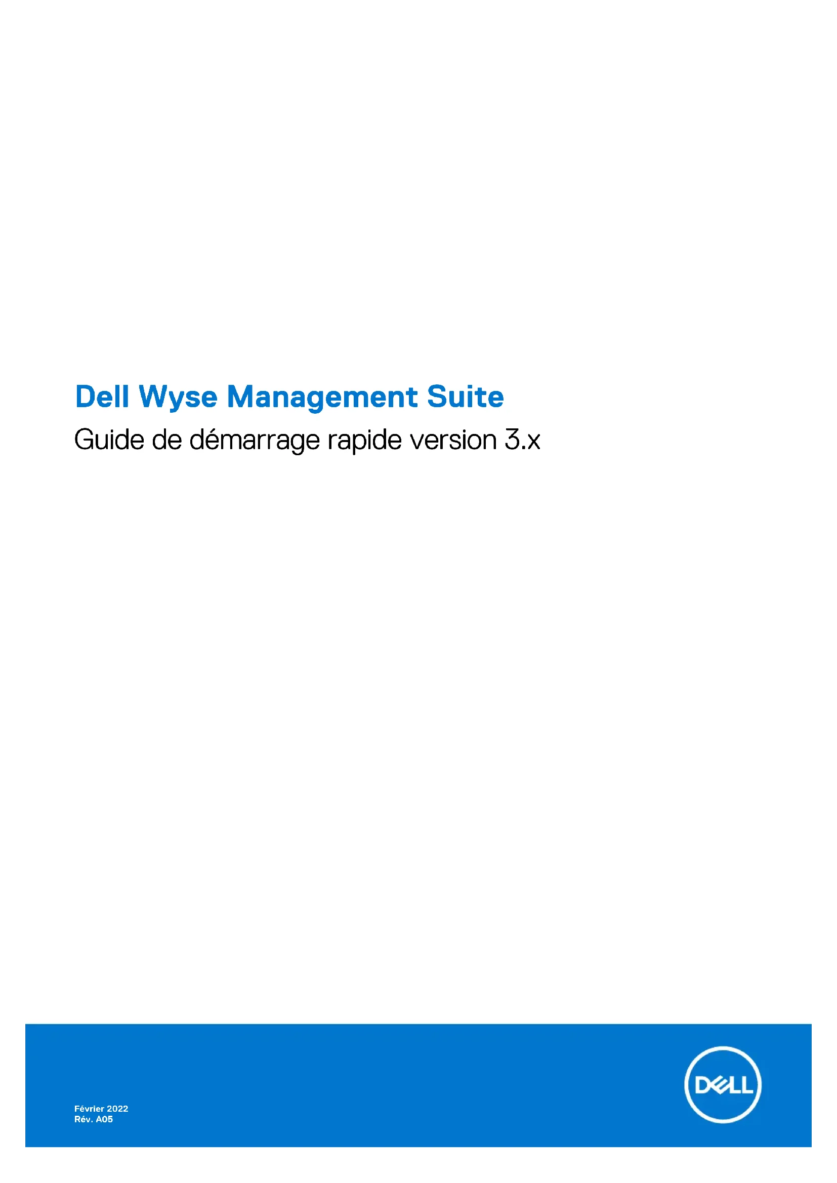 Dell Wyse Management Suite Guide de démarrage rapide version 3.x Février 2022 Rév. A05Remarques, précautions et avertissements REMARQUE : Une REMARQUE indique des informations importantes qui peuvent vous aider à mieux utiliser votre produit. PRÉCAUTION : ATTENTION vous avertit d’un risque de dommage matériel ou de perte de données et vous indique comment éviter le problème.