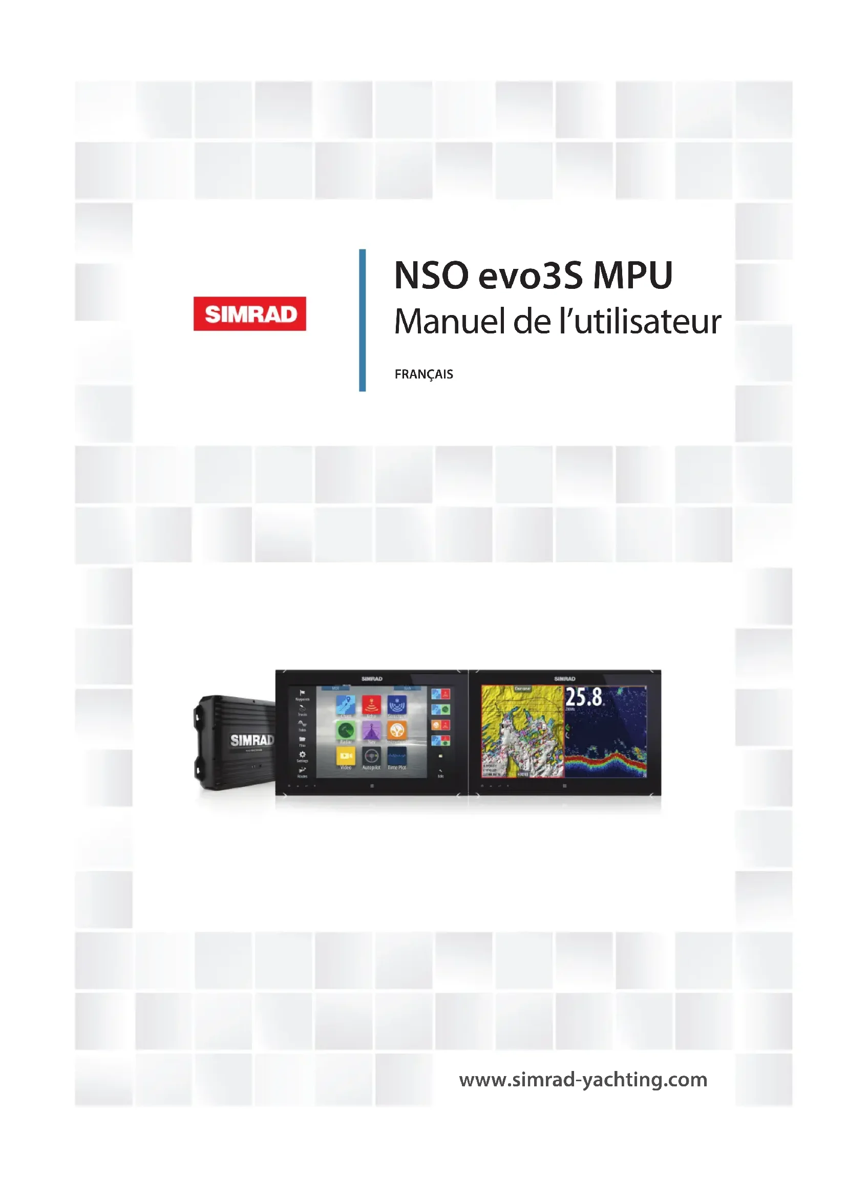 FRANÇAIS NSO evo3S MPU Manuel de l’utilisateur www.simrad-yachting.comPréface Clause de non-responsabilité Comme Navico améliore continuellement ce produit, nous nous réservons le droit d'y apporter des modifications, sans que pour autant celles-ci soient indiquées dans la présente version du manuel. Pour toute information complémentaire, veuillez consulter votre distributeur. Le propriétaire est le seul responsable de l'installation et de l'utilisation du matériel et doit s'assurer qu'il ne provoque pas d'accidents, de blessures ou de dommages matériels. L'utilisateur de ce produit est l'unique responsable du respect des règles de sécurité maritime. NAVICO HOLDING AS. ET SES FILIALES, SUCCURSALES ET SOCIÉTÉS AFFILIÉES REJETTENT TOUTE RESPONSABILITÉ EN CAS DE MAUVAISE UTILISATION DE CE PRODUIT QUI SERAIT SUSCEPTIBLE DE PROVOQUER DES ACCIDENTS OU DES DOMMAGES, OU D'ENFREINDRE LA LOI. Le présent manuel décrit la version du produit en cours au moment où ce document a été imprimé. Navico Holding AS. et ses filiales, succursales et sociétés affiliées se réservent le droit de modifier les spécifications sans préavis. Langue gouvernante la présente déclaration, les manuels d'instructions, les modes d'emploi et toute autre information relative au produit (la documentation) pourraient être traduits ou ont été traduits à partir d'une autre langue (Traduction). Dans le cas de conflits entre une traduction quelconque de la Documentation, la version anglaise de la Documentation sera la seule version officielle de la Documentation. Marques Navico