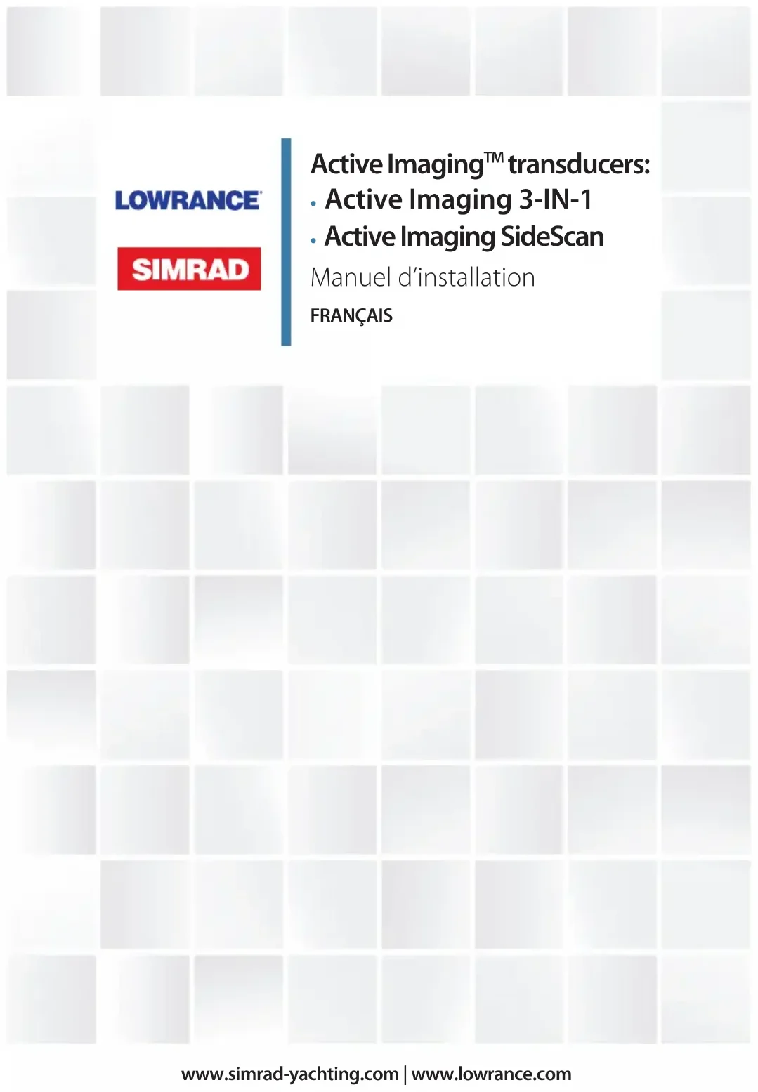 Dimensions | Active Imaging transducers Manuel d'installation 19Composants et accessoires Les composants et accessoires actualisés sont disponibles à l'adresse : http://ww2.simrad-yachting.com/fr-fr/ ou http:// ww2.lowrance.com/fr-fr/. Sonde Active Imaging 3-IN-1 (000-14489-001) Inclut la sonde avec un câble, un étrier de montage sur tableau arrière et un kit de fixation (vis, rondelles et écrous). Sonde Active Imaging SideScan (000-14490-001) Inclut la sonde avec un câble, un kit de montage sur tableau arrière et un kit de fixation (vis, rondelles et écrous). Kit de montage sur tableau arrière (000-12603-001) Inclut l'étrier de montage sur tableau arrière et un kit de fixation (vis, rondelles et écrous). Kit de montage encastré (000-12602-001) Inclut un étrier de montage encastré (2 pièces). Utilisez le matériel de fixation fourni avec la sonde. Rallonge pour sonde 9 broches de 3 m (10 pi) (000-00099-006)