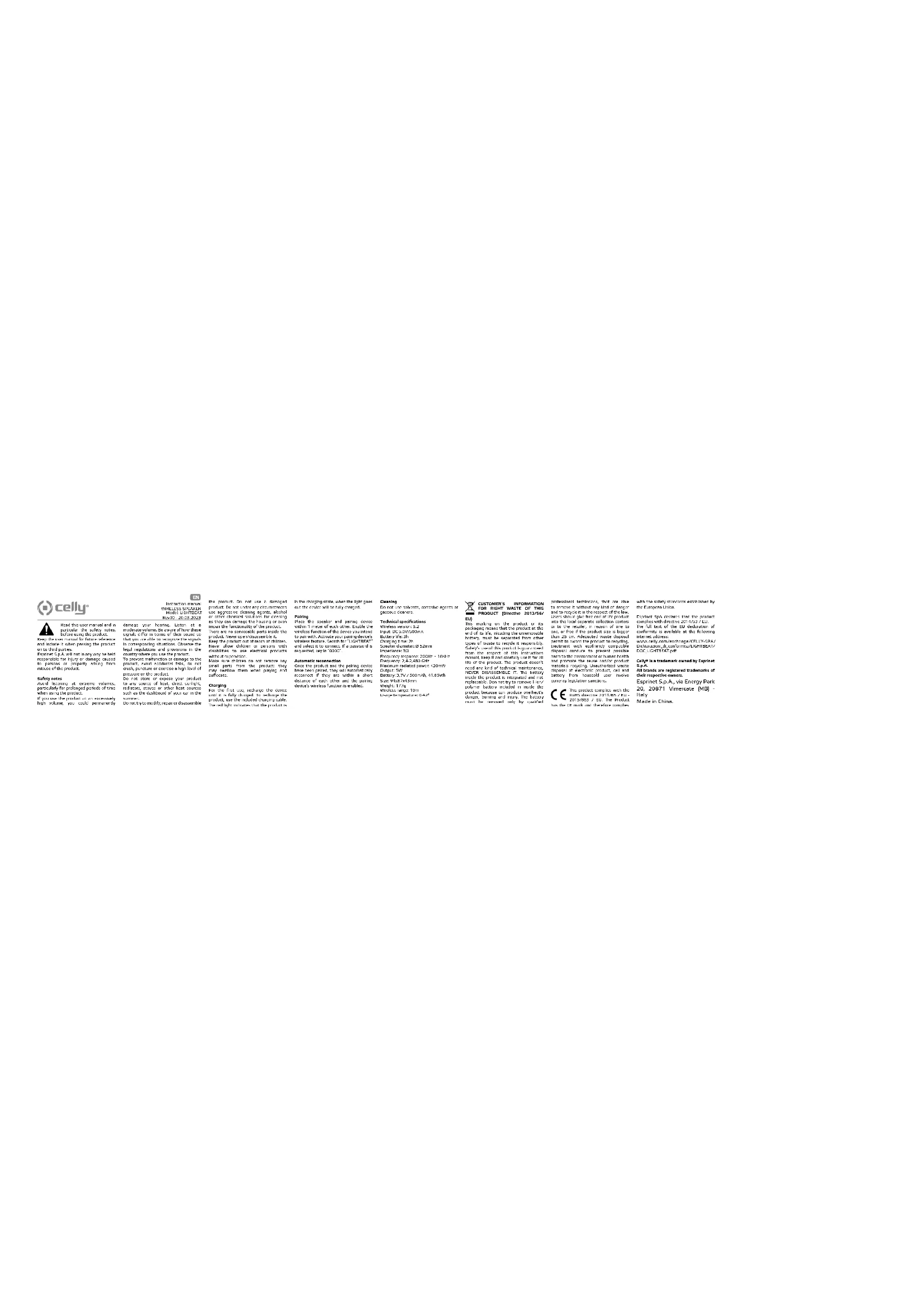 POUR LE BON DÉCHET DE CE PRODUIT (Directive 2013/56/ EU) Ce marquage sur le produit ou son emballage signifie que le produit en fin de vie, y compris la batterie inamovible, doit être séparé des autres types de déchets pour le recycler de manière responsable. L’utilisation en toute sécurité de ce produit est garantie par le respect de ce manuel d’instructions, conservez-le et utilisez-le avec précaution pendant toute la durée de vie du produit. Le produit ne nécessite aucun type de maintenance technique, NE JAMAIS LE DÉMONTER. La batterie à l’intérieur du produit est intégrée et non remplaçable. N’essayez pas de retirer la batterie li-ion/polymère incluse à l’intérieur du produit car cela peut entraîner un risque de surchauffe, de brûlure et de blessure. La batterie doit être retirée uniquement par des techniciens professionnels qualifiés, capables de la retirer sans aucun danger et de la recycler dans le respect de la loi. Les utilisateurs doivent déposer gratuitement les produits en fin de vie dans les centres de collecte séparés locaux ou chez le détaillant, dans un rapport un à un, ou gratuitement si la taille du produit est supérieure à 25 cm. Permis d’élimination des déchets adéquat pour attribuer le produit au recyclage, le traitement avec une élimination respectueuse de l’environnement conduit à prévenir d’éventuels dommages à l’environnement ou à la santé humaine et à promouvoir la réutilisation et/ou le recyclage des matériaux du produit. L’élimination non autorisée des déchets de produits électroniques, de piles et de batteries d’un utilisateur domestique implique des sanctions de la législation monétaire. Ce produit est conforme à la directive RoHS 2011/65/EU - 2015/863/EU. Le produit porte le marquage CE et est donc conforme aux normes de sécurité établies par l’Union européenne. Esprinet SpA déclare que le produit est conforme à la directive 2014/53/UE.Le texte complet de la déclaration UE de conformité est disponible à l’adresse Internet suivante : www.celly.com/exchange/CELLY-SPA/ Dichiarazioni_di_conformita/LIGHTBEAT/ DOC_LIGHTBEAT.pdf Celly® est une marque appartenant à Esprinet S.p.A. Toutes les marques sont des marques déposées de leurs propriétaires respectifs. Esprinet S.p.A., Via Energy Park 20, 20871 Vimercate (MB) - Italia Fabriqué en Chine Manuel d’instructions