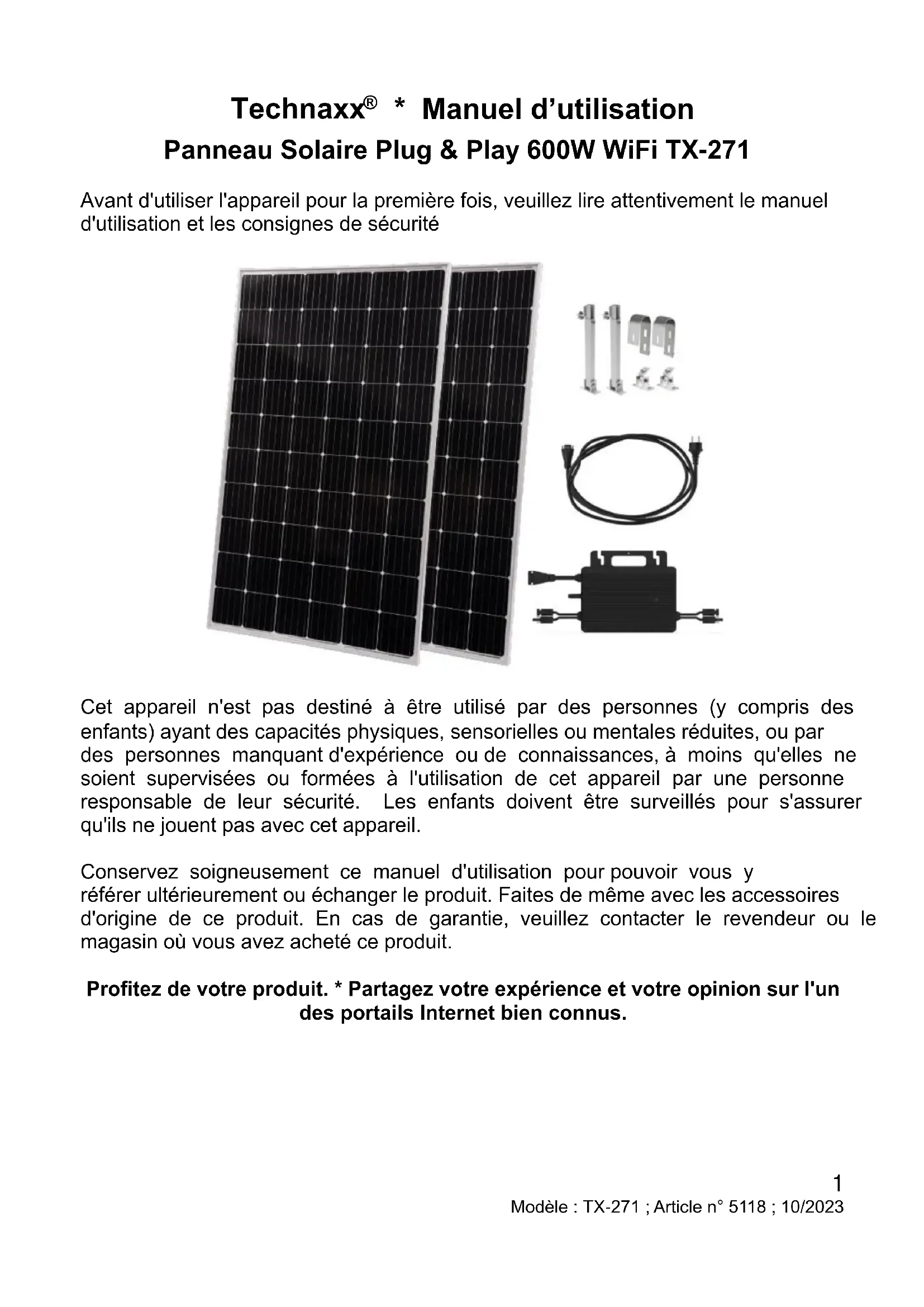 - Manuel d’utilisation Panneau Solaire Plug & Play 600W WiFi TX-271 Avant d'utiliser l'appareil pour la première fois, veuillez lire attentivement le manuel d'utilisation et les consignes de sécurité