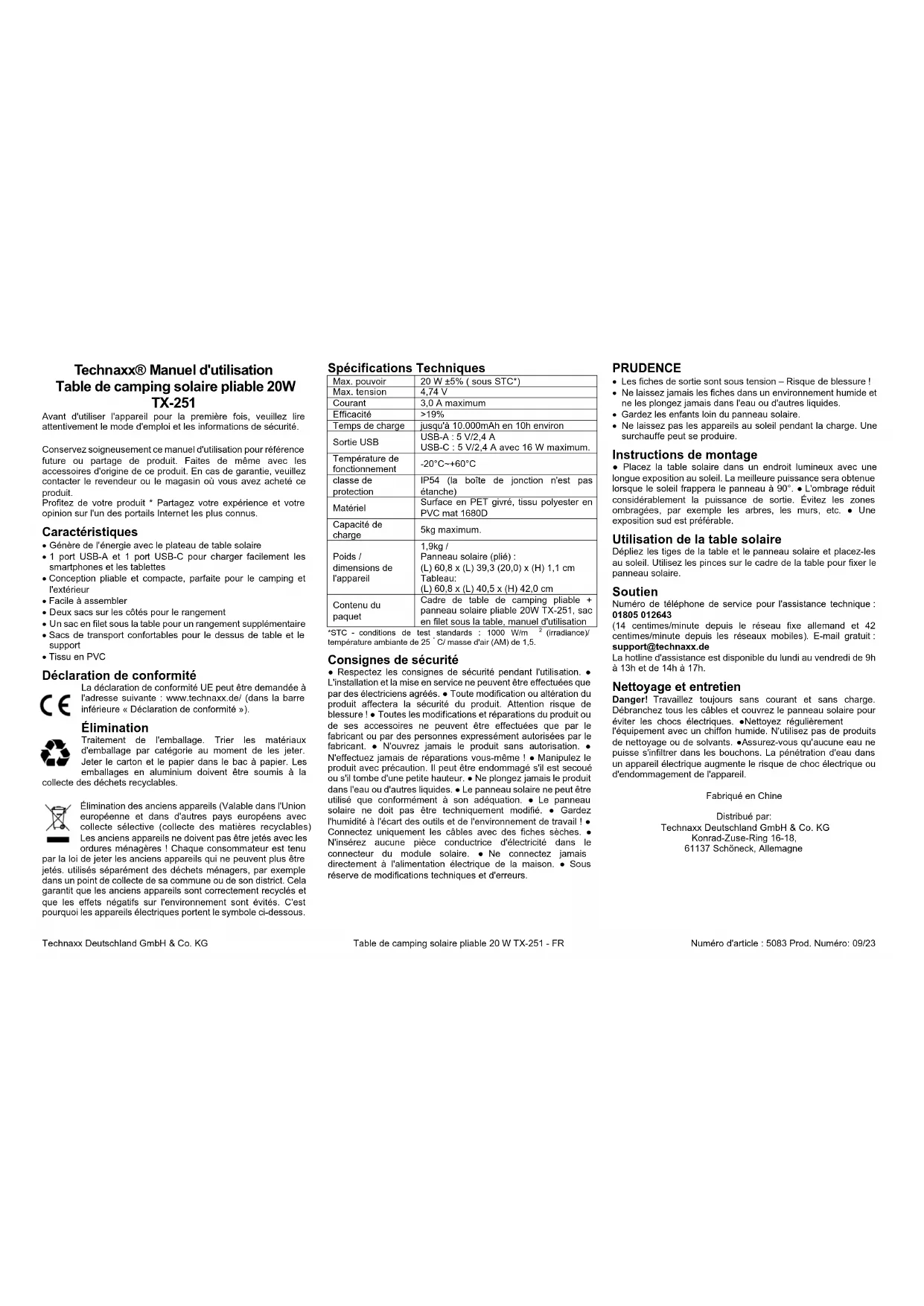 Technaxx Deutschland GmbH & Co. KG Table de camping solaire pliable 20 W TX-251 - FR Numéro d'article : 5083 Prod. Numéro: 09/23 Technaxx® Manuel d'utilisation Table de camping solaire pliable 20W TX-251 Avant d'utiliser l'appareil pour la première fois, veuillez lire attentivement le mode d'emploi et les informations de sécurité. Conservez soigneusement ce manuel d'utilisation pour référence future ou partage de produit. Faites de même avec les accessoires d'origine de ce produit. En cas de garantie, veuillez contacter le revendeur ou le magasin où vous avez acheté ce produit. Profitez de votre produit * Partagez votre expérience et votre opinion sur l'un des portails Internet les plus connus. Caractéristiques