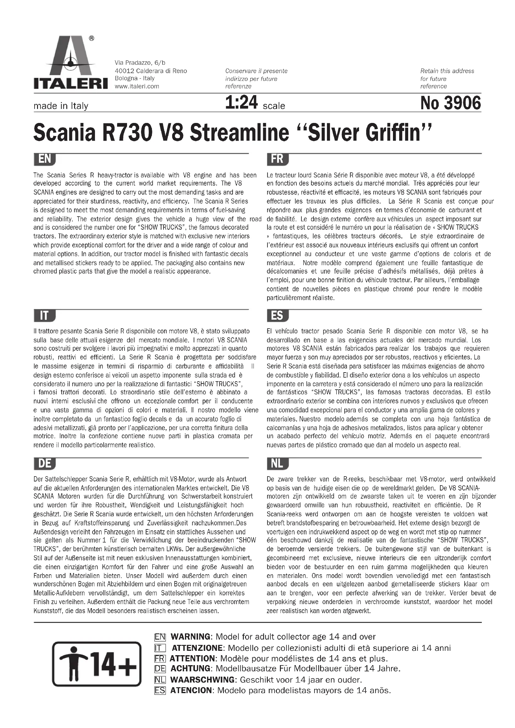 MODE D'EMPLOI Scania R730 V8 Streamline ‘‘Silver Griffin’’ Italeri