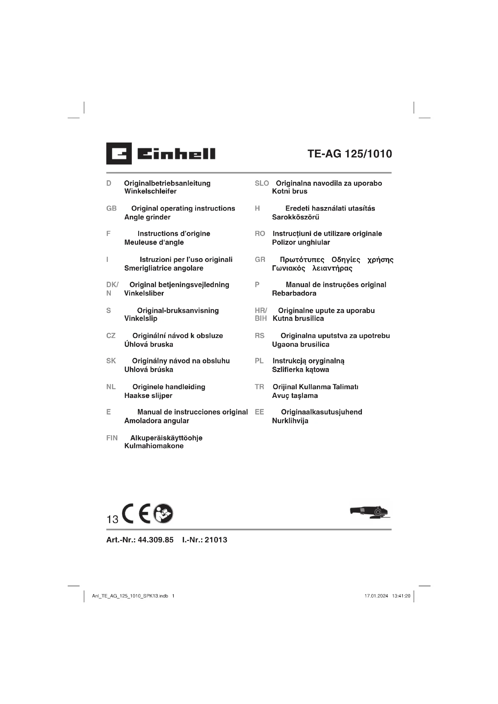 Toute réimpression ou autre reproduction de la documentation et des papiers joints aux produits, même sous forme d’extraits, est uniquement permise une fois l’accord explicite de l’Einhell Germany AG obte- nu. Sous réserve de modifi cations techniques Anl_TE_AG_125_1010_SPK13.indb 28 17.01.2024 13:41:44F