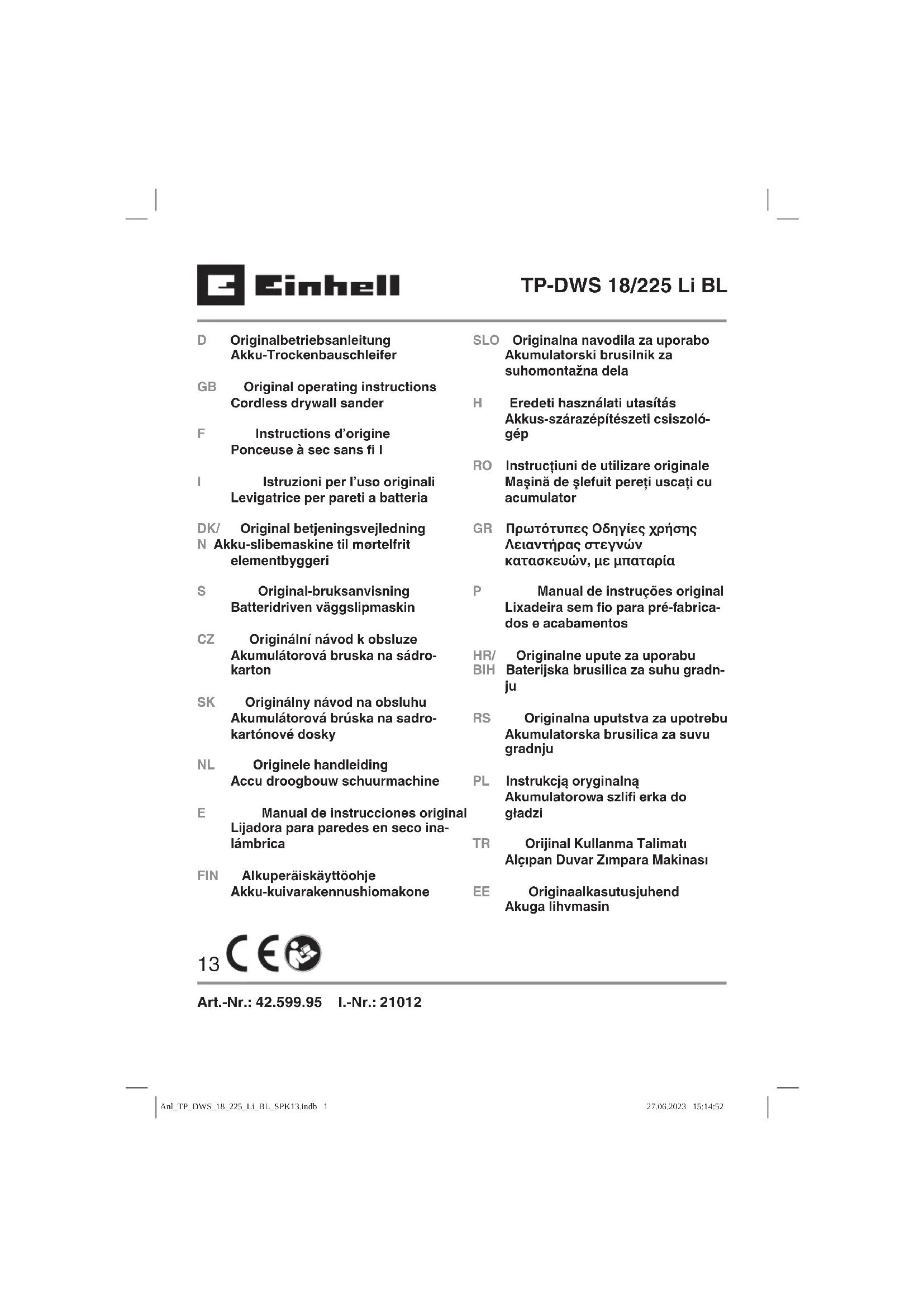 Toute réimpression ou autre reproduction de la documentation et des papiers joints aux produits, même sous forme d’extraits, est uniquement permise une fois l’accord explicite de l’Einhell Germany AG obte- nu. Sous réserve de modifi cations techniques Anl_TP_DWS_18_225_Li_BL_SPK13.indb 31Anl_TP_DWS_18_225_Li_BL_SPK13.indb 31 27.06.2023 15:15:2427.06.2023 15:15:24F