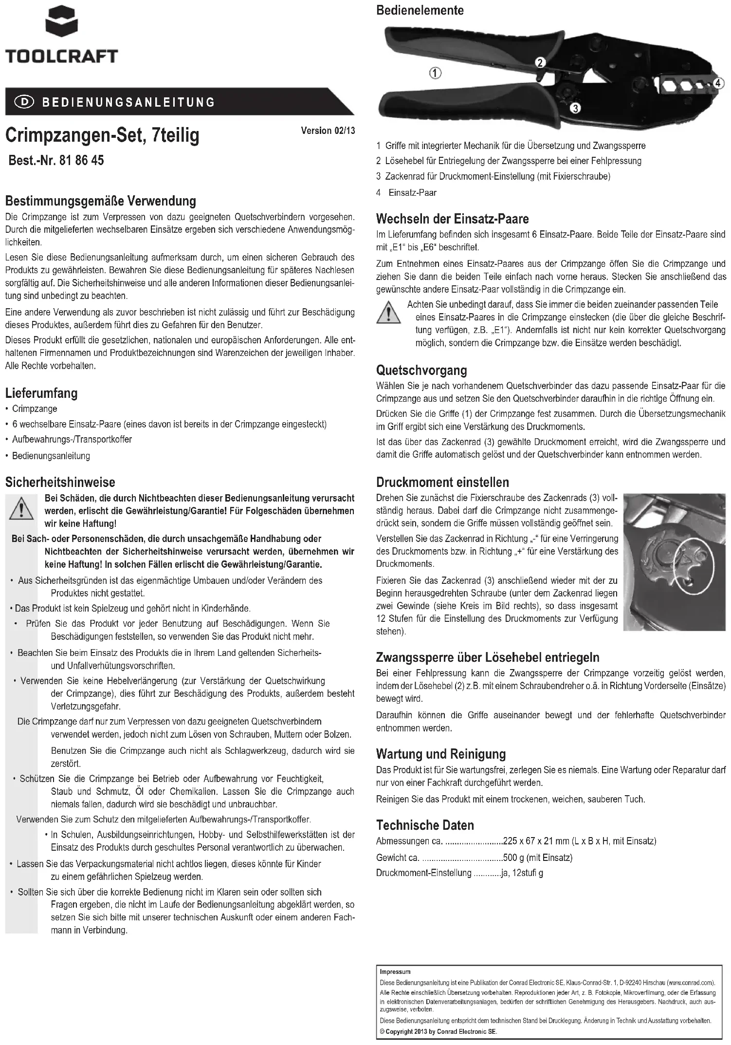 Jeu de pinces à sertir , 7 pièces N° de commande 81 86 45 Utilisation Conforme La pince à sertir est utilisée pour le sertissage de raccords à sertir appropriés. Les matrices interchangeables fournies offrent différentes possibilités d’utilisation. Lisez attentivement ce manuel d’utilisation pour vous assurer d’une utilisation sûre du produit. Conservez le présent manuel d’utilisation afi n de pouvoir le consulter ultérieurement. Il faut impérativement respecter les consignes de sécurité et les autres informations de ce manuel d’utilisation. Toute utilisation autre que celle décrite précédemment n’est pas autorisée et peut endommager l’appareil. Dans le cas contraire, cela génère des risques pour l’utilisateur. Cet appareil satisfait aux prescriptions légales nationales et européennes. Tous les noms d’en- treprises et les appellations d’appareils fi gurant dans ce manuel d’utilisation sont des marques déposées de leurs propriétaires respectifs. Tous droits réservés. Contenu de la livraison