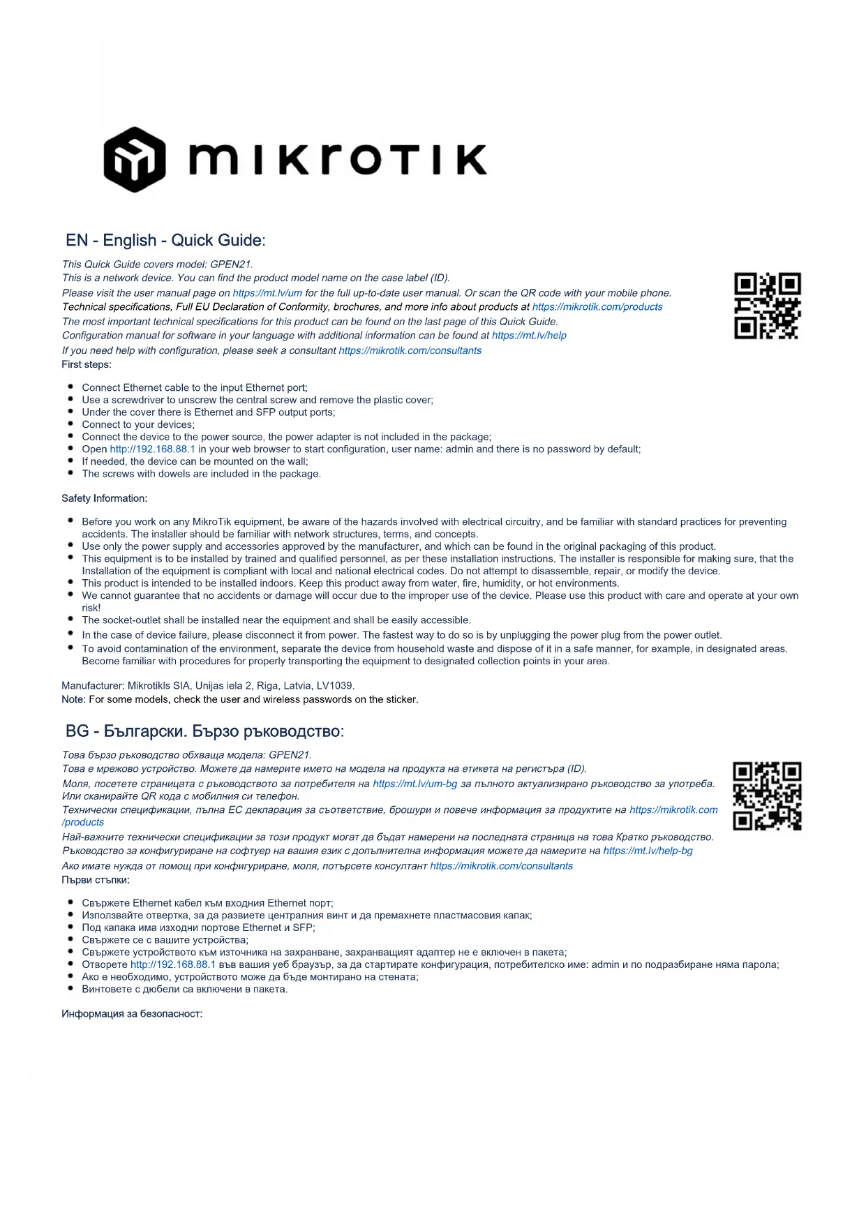 Ceci est un périphérique réseau. Vous pouvez trouver le nom du modèle du produit sur l'étiquette du boîtier (ID). Veuillez visiter la page du manuel d'utilisation sur pour le manuel d'utilisation complet et à jour.https://mt.lv/um-fr Ou scannez le code QR avec votre téléphone portable. Spécifications techniques, déclaration de conformité UE complète, brochures et plus d'informations sur les produits surhttps://mikrotik.com /products Les spécifications techniques les plus importantes de ce produit se trouvent sur la dernière page de ce guide rapide. Vous trouverez le manuel de configuration du logiciel dans votre langue avec des informations supplémentaires sur https://mt.lv/help-fr Si vous avez besoin d'aide pour la configuration, veuillez consulter un consultant https://mikrotik.com/consultants Premiers pas:Connectez le câble Ethernet au port Ethernet d'entrée; Utilisez un tournevis pour dévisser la vis centrale et retirer le couvercle en plastique; Sous le couvercle, il y a des ports de sortie Ethernet et SFP; Connectez-vous à vos appareils; Connectez l'appareil à la source d'alimentation, l'adaptateur secteur n'est pas inclus dans l'emballage; Ouvrez dans votre navigateur Web pour démarrer la configuration, nom d'utilisateur: admin et il n'y a pas de mot de passe par défaut;http://192.168.88.1 Si nécessaire, l'appareil peut être monté sur le mur; Les vis avec chevilles sont incluses dans l'emballage. Information sur la sécurité: Avant de travailler sur un équipement MikroTik, soyez conscient des dangers liés aux circuits électriques et familiarisez-vous avec les pratiques standard de prévention des accidents.Le programme d'installation doit être familiarisé avec les structures, les termes et les concepts du réseau. Utilisez uniquement l'alimentation et les accessoires approuvés par le fabricant et qui se trouvent dans l'emballage d'origine de ce produit. Cet équipement doit être installé par du personnel formé et qualifié, conformément à ces instructions d'installation.L'installateur est responsable de s'assurer que l'installation de l'équipement est conforme aux codes électriques locaux et nationaux.N'essayez pas de démonter, réparer ou modifier l'appareil. Ce produit est destiné à être installé à l'intérieur.Gardez ce produit loin de l'eau, du feu, de l'humidité ou des environnements chauds. Nous ne pouvons garantir qu'aucun accident ou dommage ne se produira en raison d'une mauvaise utilisation de l'appareil.Veuillez utiliser ce produit avec soin et l'utiliser à vos propres risques! La prise de courant doit être installée à proximité de l'équipement et doit être facilement accessible. En cas de panne de l'appareil, veuillez le déconnecter de l'alimentation. La façon la plus rapide de le faire est de débrancher l'adaptateur secteur de la prise de courant. Pour éviter la contamination de l'environnement, séparez l'appareil des déchets ménagers et éliminez-le de manière sûre, par exemple dans des zones désignées. Familiarisez-vous avec les procédures pour transporter correctement l'équipement vers les points de collecte désignés dans votre région. Fabricant: Mikrotikls SIA, Unijas iela 2, Riga, Lettonie, LV1039. Pour certains modèles, vérifiez les mots de passe utilisateur et sans fil sur l'autocollant.Noter: HR - Hrvatski. Brzi vodič: Ovaj brzi vodič obuhvaća model: GPEN21.
