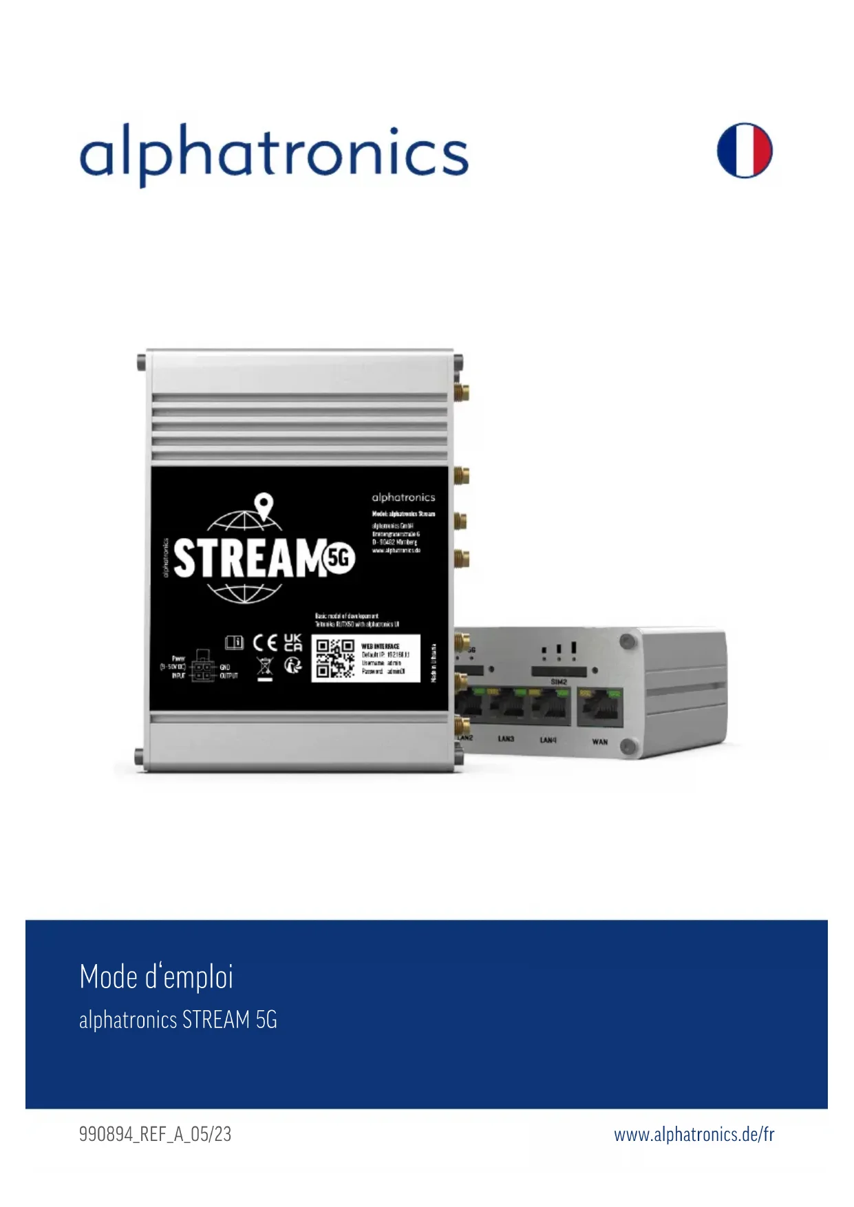 Droit d‘auteur Ce mode d‘emploi est protégé par les droits d‘auteur. Toute reproduction ou réimpression, même partielle, ainsi que la représentation des illustrations, même modiées, ne sont autorisées qu‘avec l‘accord écrit du fabricant. Remarques sur la garantie La période de garantie commence au moment de l‘achat de l‘appareil. Veuillez prouver cette date par le justicatif d‘achat. Conservez soigneusement ces documents. Notre prestation de garantie est régie par nos conditions de garantie en vigueur au moment de l‘achat. Pour ce produit, la durée de la garantie est de 3 ans. Mentions légales Apple®, iPhone® et iPad® sont des marques déposées, App Store est une marque de service d‘Apple Inc. déposée. aux États-Unis et dans d‘autres pays. Google® et Android® sont des marques déposées de Google, Inc. Les autres noms ou dési- gnations mentionnés peuvent être des marques commerciales ou des marques déposées de l être le propriétaire respectif. Déclaration de licence / Déclaration de code GPL Ce produit contient des codes logiciels développés par des tiers, y compris des codes logiciels qui Licence publique générale GNU version 2 („GPLv2“). Déclaration de conformité simpliée selon la directive RED Par la présente, la société alphatronics GmbH déclare que le type d‘appareil radio décrit est conforme à la directive 2014/53/UE et aux autres directives applicables au produit. Le texte complet de la déclaration de conformité UE est disponible à l‘adresse Internet suivante : https://alphatronics.de/de/support/konformitaetserklaerung,83/ Informations légales supplémentaires : Puissance d‘émission maximale : WIFI 2.4 GHz : 17.82 dBm (EIRP) WIFI 5.0 GHz : 20.40 dBm (EIRP) WIFI 5,8 GHz : 13,26 dBm (EIRP) Bande LTE 1/2/8/20/28/28/40 : 23 dBm Bande LTE 7 : 24 dBm Bande LTE 42/43 : 26 dBm 5G NR bande 1/2/8/20/28/28/40 : 23 dBm 5G NR bande 41/77/78 : 26 dBmalphatronics GmbH Breitengraserstraße 6 90482 Nürnberg Tel. +49 (0) 911 21 65 54-0 E-Mail: info@alphatronics.de Fax +49 (0) 911 21 65 54-65 Web: www.alphatronics.de alphatronics-Service: Tel. +49 (0) 911 21 65 54-45 E-Mail: service@alphatronics.de