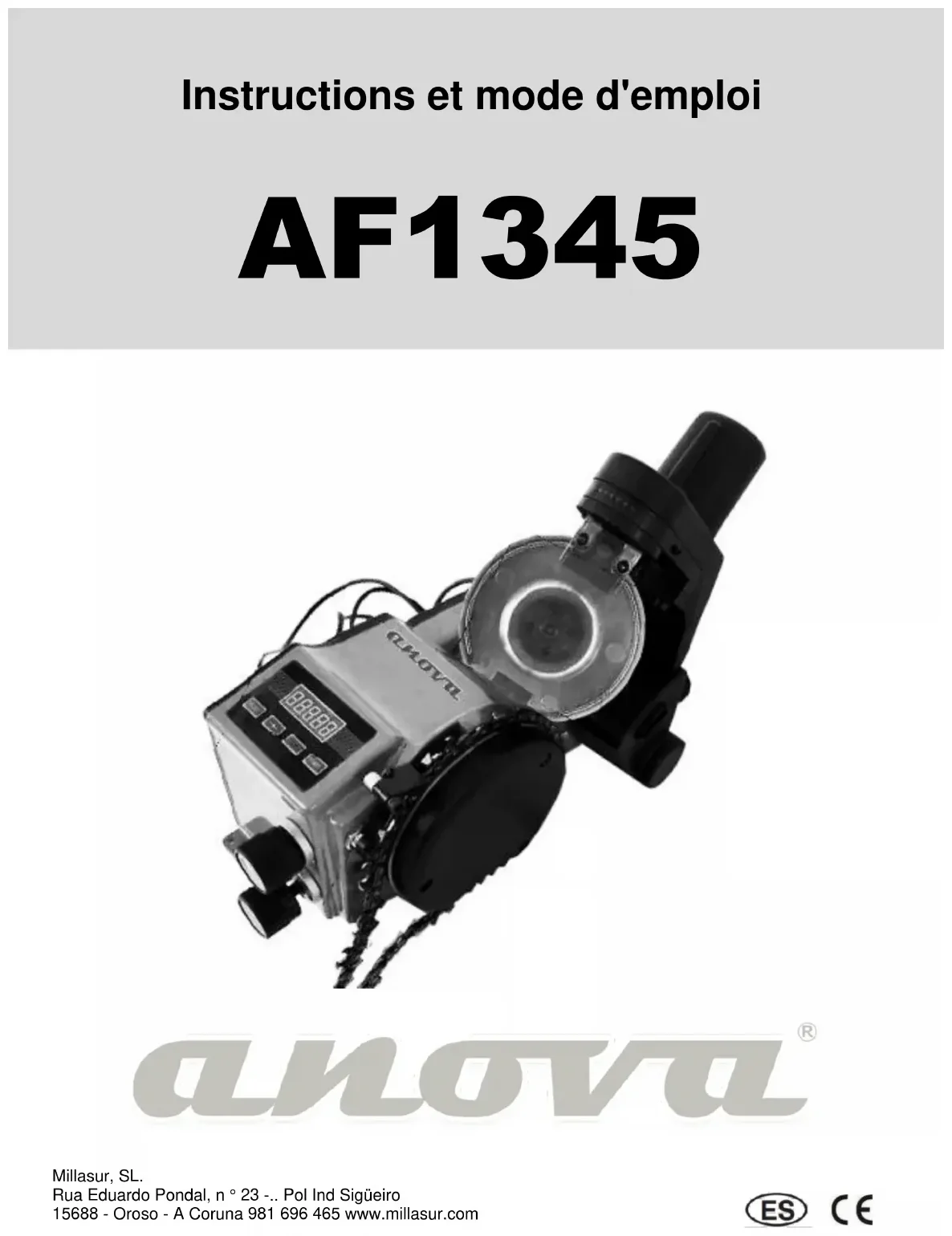 Millasur, SL. Rua Eduardo Pondal, n ° 23 -.. Pol Ind Sigüeiro 15688 - Oroso - A Coruna 981 696 465 www.millasur.com2 ANOVA Vous voulez vous féliciter d'avoir choisi un de nos produits et garantit l'assistance et la coopération qui a toujours distingué notre marque au fil du temps. Cette machine est conçue pour durer de nombreuses années et être très utile si elle est utilisée conformément aux instructions du manuel. Nous vous recommandons donc de lire ce manuel et suivez toutes nos recommandations. Pour plus d'informations ou questions, vous pouvez contacter par nos médias Web tels que www.anova.es.