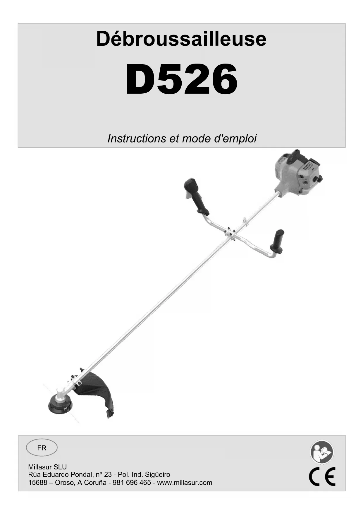 Conformément aux différentes directives CE, ce document confirme que, de par sa conception et sa construction, et selon le marquage CE imprimé dessus par le fabricant, la machine identifiée dans ce document est conforme aux exigences pertinentes et fondamentales de santé et de sécurité des directives CE susmentionnées. Cette déclaration valide le produit pour afficher le symbole CE. Dans le cas où la machine est modifiée et que cette modification n'est pas approuvée par le fabricant et communiquée au distributeur, cette déclaration perdra sa valeur et sa validité. Nom de la machine : DÉBROUSSAILLEUSE Modèle : D526 Norme reconnue et approuvée à laquelle il se conforme : Directive 2006/42/CE 2014/30/UE