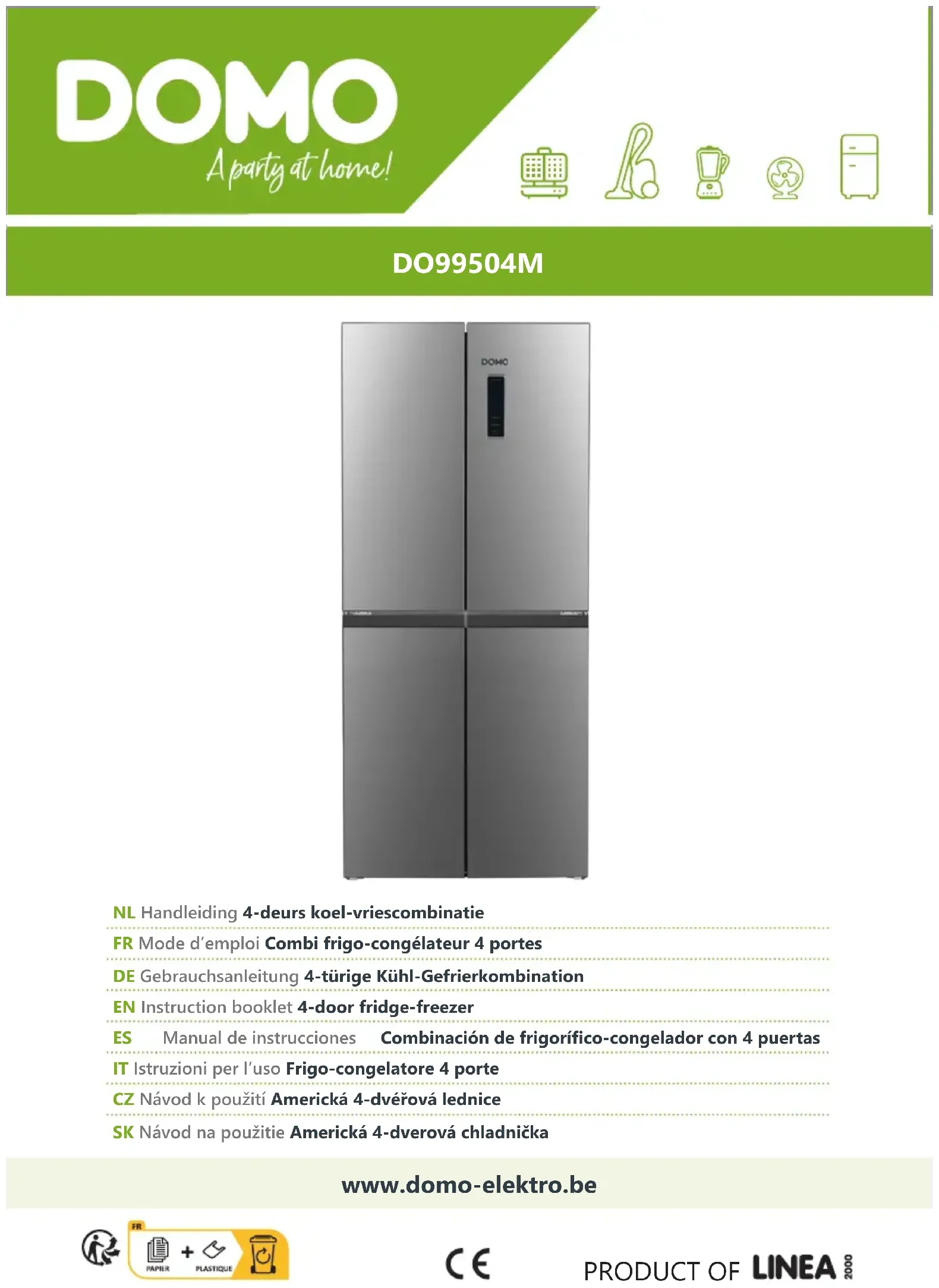 DIRECTIVES Ce symbole sur le produit ou son emballage indique que ce produit ne peut être traité comme déchet ménager. Il doit plutôt être remis au point de ramassage concerné, se chargeant du recyclage du matériel électrique et électronique. En vous assurant que ce produit est éliminé correctement, vous favorisez la prévention des conséquences négatives pour l’environnement et la santé humaine qui, sinon, seraient le résultat d’un traitement inapproprié des déchets de ce produit. Pour obtenir plus de détails sur le recyclage de ce produit, veuillez prendre contact avec le bureau municipal de votre région, votre service d’élimination des déchets ménagers ou le magasin où vous avez acheté le produit. L’emballage est recyclable. Traitez l’emballage écologiquement. Cet appareil est conforme à toutes les exigences européennes en matière de sécurité, de santé et de protection de l’environnement. La déclaration UE de cet appareil peut être demandée à tout moment à l’adresse suivante : info@linea2000.be38 www.domo-elektro.be