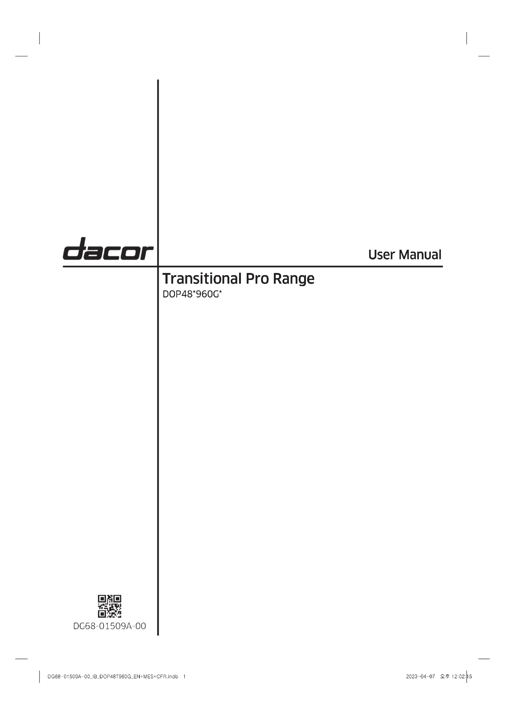 - Consulter le revendeur ou un technicien radio/TV expérimenté pour obtenir de l’aide. DÉCLARATION SUR L’EXPOSITION AU RAYONNEMENT : Ce dispositif est conforme aux limites d’exposition au rayonnement de la FCC et de l’IC RSS-102 établies pour un environnement non contrôlé. Ce dispositif doit être installé et utilisé de manière à ce qu’il y ait au moins 20 cm (8 po) entre le radiateur et votre corps. Cet appareil et son/ses antenne(s) ne doivent pas être placé(s) ensemble ni utilisé(s) conjointement avec une autre antenne ou un autre émetteur. DG68-01509A-00_IB_DOP48T960G_EN+MES+CFR.indb 5DG68-01509A-00_IB_DOP48T960G_EN+MES+CFR.indb 5 2023-04-07 오후 12:03:102023-04-07 오후 12:03:10À nos clients fidèles : Nous vous félicitons d’avoir acheté les tout derniers produits Dacor! La combinaison unique de nos caractéristiques, de notre style et de nos performances fait de nous un atout majeur pour votre maison. Pour vous familiariser avec les commandes, les fonctions et le plein potentiel de votre nouvel appareil Dacor, lisez attentivement ce manuel d’utilisation et d’entretien, en commençant par la section Avant de commencer. Nous concevons et fabriquons tous les appareils Dacor avec qualité et fierté, tout en travaillant dans le cadre des valeurs de notre entreprise. En cas de problème avec votre appareil, consultez d’abord la section Dépannage de ce manuel pour vous guider. Vous y trouverez des suggestions et des solutions utiles avant d’appeler le service après-vente. Les précieux commentaires de nos clients nous aident à améliorer continuellement nos produits et services. N’hésitez donc pas à communiquer avec notre équipe du service clientèle pour obtenir de l’aide sur n’importe quel produit. Assurance client de Dacor