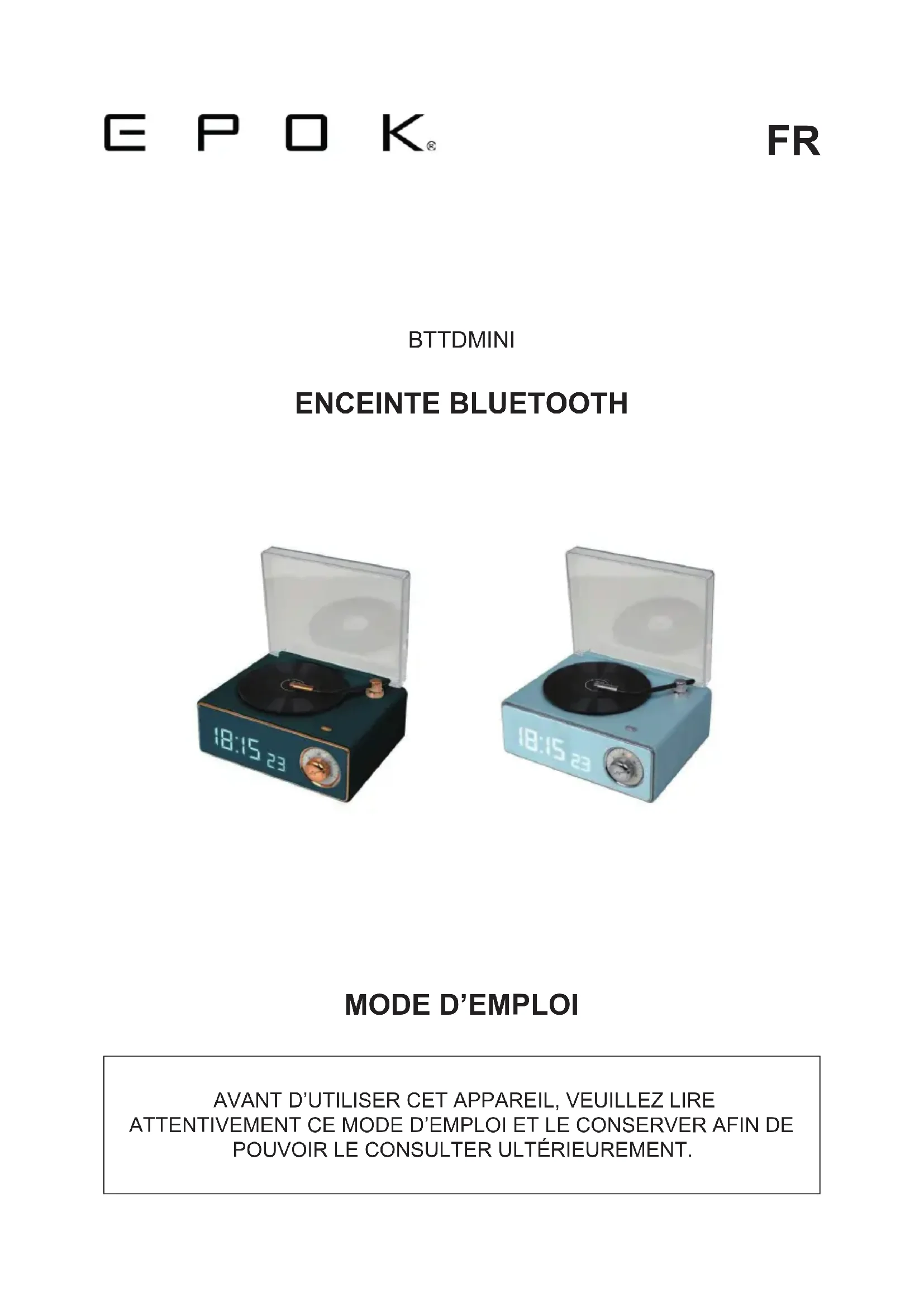 Appuyez deux fois pour passer à la station suivante. Remarque : La platine tourne lorsque de la musique est jouée. Rappel : Veuillez connecter le câble de chargement au port USB-C pour faire office d’antenne radio. Avertissement pile Risque de feu ou d’explosion si la batterie est remplacée par un type de batterie incorrect. L’élimination d’une batterie dans un feu ou un four chaud ou le fait d’écraser ou de découper manuellement une batterie peut provoquer une explosion;- FR 7 - Le fait de laisser une batterie dans un milieu ambiant aux températures extrêmement élevées peut engendrer une explosion ou la fuite d’un liquide ou d’un gaz inflammable; Une batterie soumise à une pression atmosphérique extrêmement faible peut causer une explosion ou la fuite d’un liquide ou d’un gaz inflammable. Veuillez consulter les informations sur le dessous de l’emballage concernant la sécurité et l’électricité avant d’installer ou d’utiliser l’appareil. Caractéristiques techniques de l’appareil Type Caractéristiques techniques Type Caractéristiques techniques Version du Bluetooth 5.3 Durée de chargement
