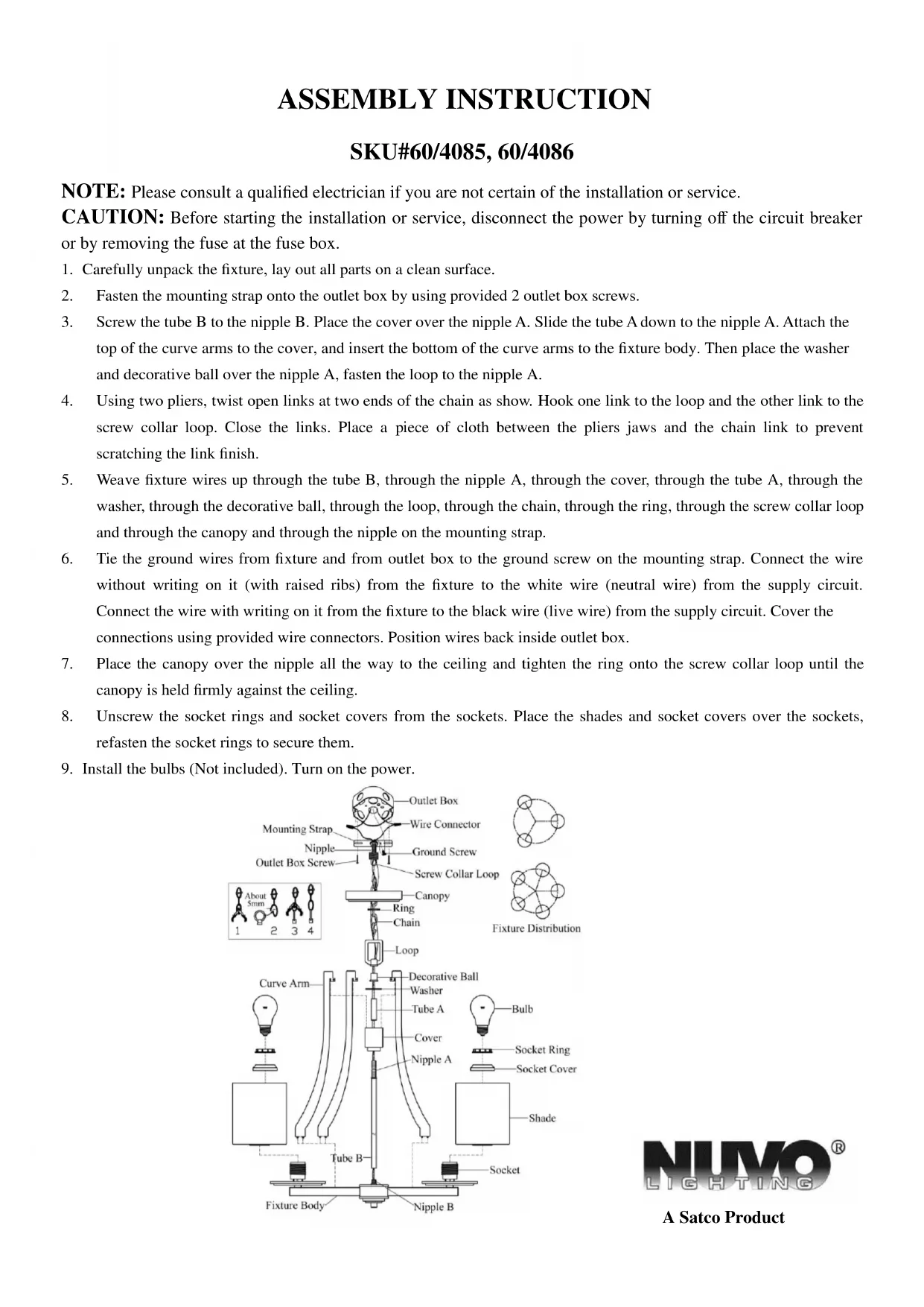 2. Fixez la Anneau de Montage sur le Coffret de prise de courant à l'aide des Vis pour coffret de prise de courant fournies. 3. Visser le tube B sur l’embout fileté B. Placer le cache sur l’embout fileté A. Faire glisser le tube A vers le bas sur l’embout fileté A. Attacher le haut des bras courbés au cache, et insérer le bas des bras courbés sur le corps du luminaire. Placer ensuite la rondelle et la boule décorative sur l’embout fileté A.Serrez la Boucle sur le Manchon filetés A. 4. A l'aide de deux pinces, ouvrez les maillons aux deux extrémités de la Chaîne. Accrochez l'un des maillons à la Boucle et les autres maillons à la Boucle de collier de vis. Refermez les maillons. Placez un morceau de tissu entre les mâchoires des pinces et les maillons de la chaîne afin d'éviter d'endommager la finition des maillons. 5. Faites passer les fils du luminaire dans la tube B, dans la filetés A, dans la couvrir , dans la tube A, dans la rondelle, dans la boule décorative , dans la Boucle, dans la Chaîne, dans l'Anneau, dans le Couvercle, dans la Boucle de collier de vis et dans le Faîteau sur la Bande de montage. 6. Attachez le fil de terre du luminaire et du Coffret de prise de courant sur la Vis de terre sur la Anneau de Montage. Connectez le fil sans mention écrite (avec les cannelures) du luminaire sur le fil blanc(neutres) du circuit d'alimentation. Connectez le fil du luminaire qui comporte une mention écrite sur le fil noir (alimentation) du circuit d'alimentation. Couvrez les connexions à l'aide des Connecteurs de fils fournis. Faites entrer les fils dans le Coffret de prise de courant. 7. Placez le Couvercle sur l'Embout jusqu'au niveau du Plafond, et fixez l'Anneau sur la Boucle de collier à vis jusqu'à ce que le Couvercle soit fermement fixé contre le plafond. 8. Dévissez les Anneaux à douille des Douilles. Placez les Abat-jours sur les Douilles, et remettez en placez les Anneaux de douille sur les Douilles de façon à maintenir les Abat-jours en position.
