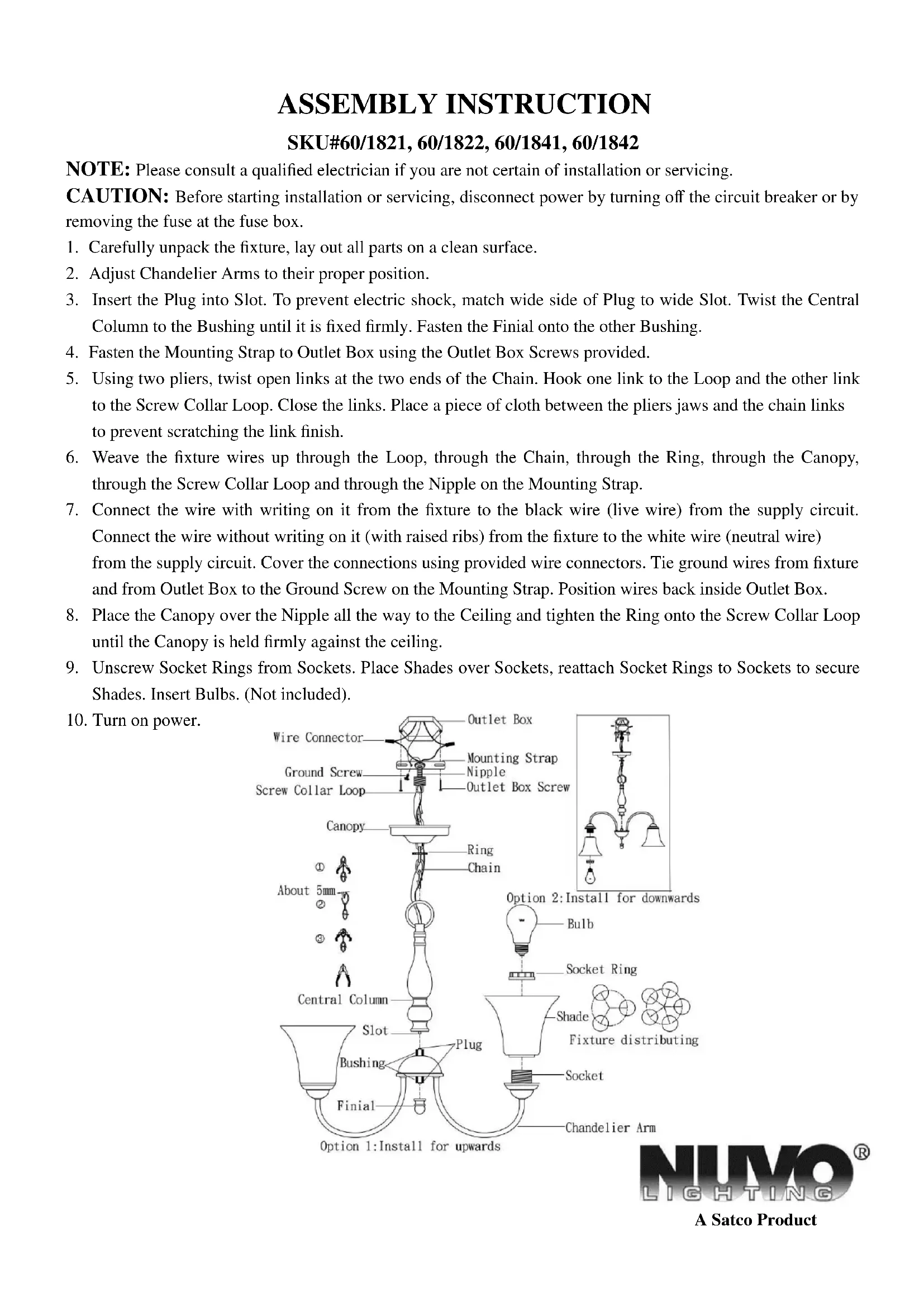 5. A l'aide de deux pinces, ouvrez les maillons aux deux extrémités de la Chaîne. Accrochez l'un des maillons à la Boucle et les autres maillons à la Boucle de collier de vis. Refermez les maillons. Placez un morceau de tissu entre les mâchoires des pinces et les maillons de la chaîne afin d'éviter d'endommager la finition des maillons. 6. Faites passer les fils du luminaire dans la Boucle, dans la Chaîne, dans l'Anneau, dans le Couvercle, dans la Boucle de collier de vis et dans le Faîteau sur la Bande de montage. 7. Connectez le fil du luminaire qui comporte une mention écrite sur le fil noir (fil sous tension) du circuit d'alimentation. Connectez le fil sans mention écrite (avec les cannelures) du luminaire sur le fil blanc (fil neutre) du circuit d'alimentation. Couvrez les connexions à l'aide des connecteurs de fils fournis. Attachez les fils de terre du luminaire et du Coffret de prise de courant sur la Vis de terre sur la Bande de montage. Faites entrer les fils dans le Coffret de prise de courant. 8. Placez le Couvercle sur l'Embout jusqu'au niveau du Plafond, et fixez l'Anneau sur la Boucle de collier à vis jusqu'à ce que le Couvercle soit fermement fixé contre le plafond. 9. Dévissez les Anneaux à douille des Douilles. Placez les Abat-jours sur les Douilles, et remettez en placez les Anneaux de douille sur les Douilles de façon à maintenir les Abat-jours en position. Installez l'ampoule. (Non fournie).