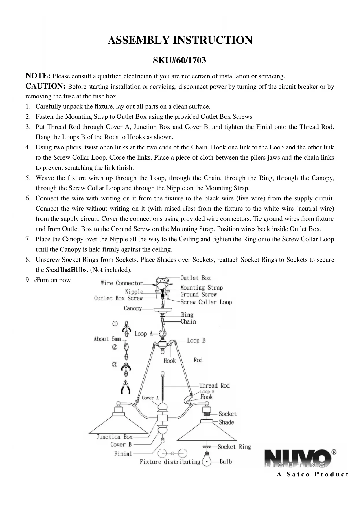 Faîteau sur le Montant fileté. Accrochez les Boucles B des Montants sur les Crochets ainsi qu’illustré. A l'aide de deux pinces, ouvrez les maillons aux deux extrémités de la Chaîne. Accrochez l'un des maillo les autres maillons à la Boucle de collier de vis. Refermez les maillons. Placez un morceau de tissu entre les mâchoires des pinces et les maillons de la chaîne afin d'éviter d'endommager la finition des maillons. Faites passer les fils du luminaire dans la Boucle, dans la Chaîne, dans l'Anneau, dans le C collier de vis et dans le Faîteau sur la Bande de montage. Connectez le fil du luminaire qui comporte une mention é Connectez le fil sans mention écrite (avec les cannelures) du luminaire sur le fil blanc (fil neutre) du circuit d'alimentation. Couvrez les connexions à l'aide des connecteurs de fils fournis. Attachez les fils de terre du luminaire et du Coffret de prise de courant sur la Vis de terre sur la Bande de montage. Faites entrer les fils dans le Coffret de prise de courant. Placez le que le Couvercle soit fermement fixé contre le plafond. Dévissez les Anneaux à douille des Douilles. Placez les A douille sur les Douilles de façon à maintenir les Abat-jours en position. Installez l'ampoule. (Non fournie).