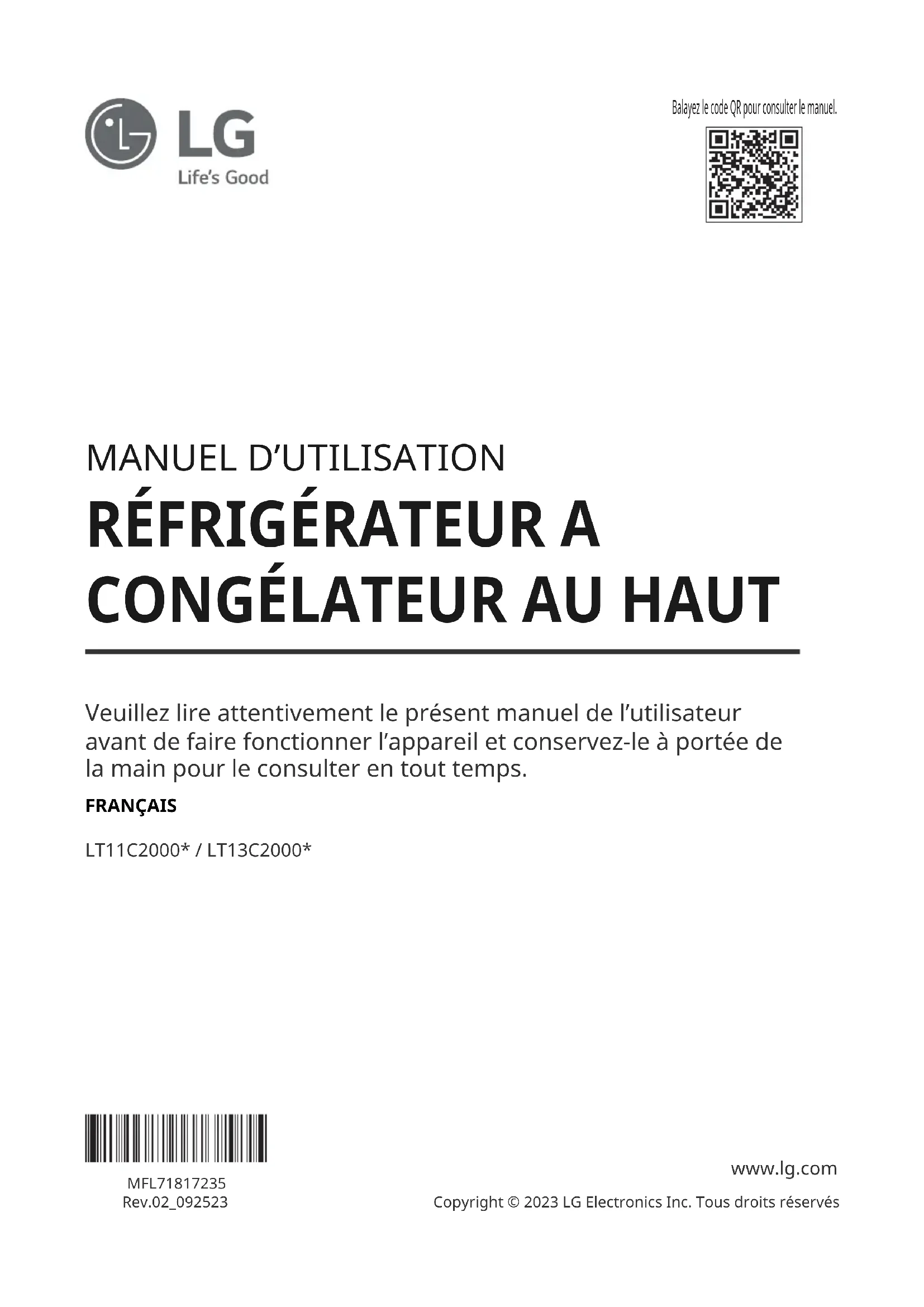 Veuillez lire attentivement le présent manuel de lʼutilisateur avant de faire fonctionner lʼappareil et conservez-le à portée de la main pour le consulter en tout temps. FRANÇAIS LT11C2000* / LT13C2000* MFL71817235Rev.02_092523 www.lg.com Copyright © 2023 LG Electronics Inc. Tous droits réservés Balayez le code QR pour consulter le manuel.TABLE DES MATIÈRES
