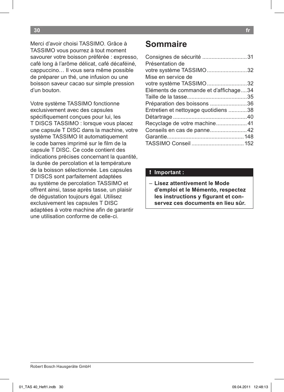 !! Important : –– Lisez attentivement le Mode d’emploi et le Mémento, respectez les instructions y figurant et con servez ces documents en lieu sûr. Consignes de sécurité ¡¡Risque de choc électrique ! ¡¡Risque de brûlure ! –– Cette machine est prévue pour la préparation de petites quantités de café pour un usage domestique ou pour l’utilisation dans un environnement non commercial comme celui d’une cuisine pour les employés dans une boutique, un bureau, une entreprise agricole ou artisanale, ou encore dans une pension, un hôtel de petite taille ou autre lieu résidentiel similaire. –– Respectez impérativement les indications figurant sur la plaque signalétique pour utiliser et raccorder l’appareil. –– N’utilisez votre système TASSIMO que si le cordon d’alimentation et l’appareil sont exempts de tout dommage. –– Utilisez la machine uniquement à l’intérieur d’un local, à température ambiante et à une altitude ne dépassant pas 2000 m au-dessus du niveau de la mer. –– Ne confiez pas la machine à des personnes (enfants compris) aux capacités physiques, sensorielles ou intellectuelles diminuées ou n’ayant pas l’habitude ou les connaissances suffisantes, sauf sous surveillance ou bien après une mise au courant sur l’utilisation de la machine, effectuée par une personne responsable de leur sécurité. –– Tenir les enfants éloignés de la machine. –– Surveillez les enfants afin qu’ils ne jouent pas avec la machine. –– En cas de défaut, débranchez immédiatement le cordon électrique. –– Toutes les réparations sur l’appareil, comme le remplacement d’un cordon d’alimentation endommagé, doivent être effectuées par notre Service Après-Vente afin d’éviter tout risque. –– Ne plongez jamais l’appareil ou le cordon électrique dans l’eau. –– Attendez que le voyant orange soit allumé avant d’ouvrir l’unité de percolation. –– Durant la préparation d’une boisson, n’ouvrez jamais le système de percolation. –– N’oubliez pas que les boissons préparées sont brûlantes. 04/2011 01_TAS 40_Heft1.indb 31
