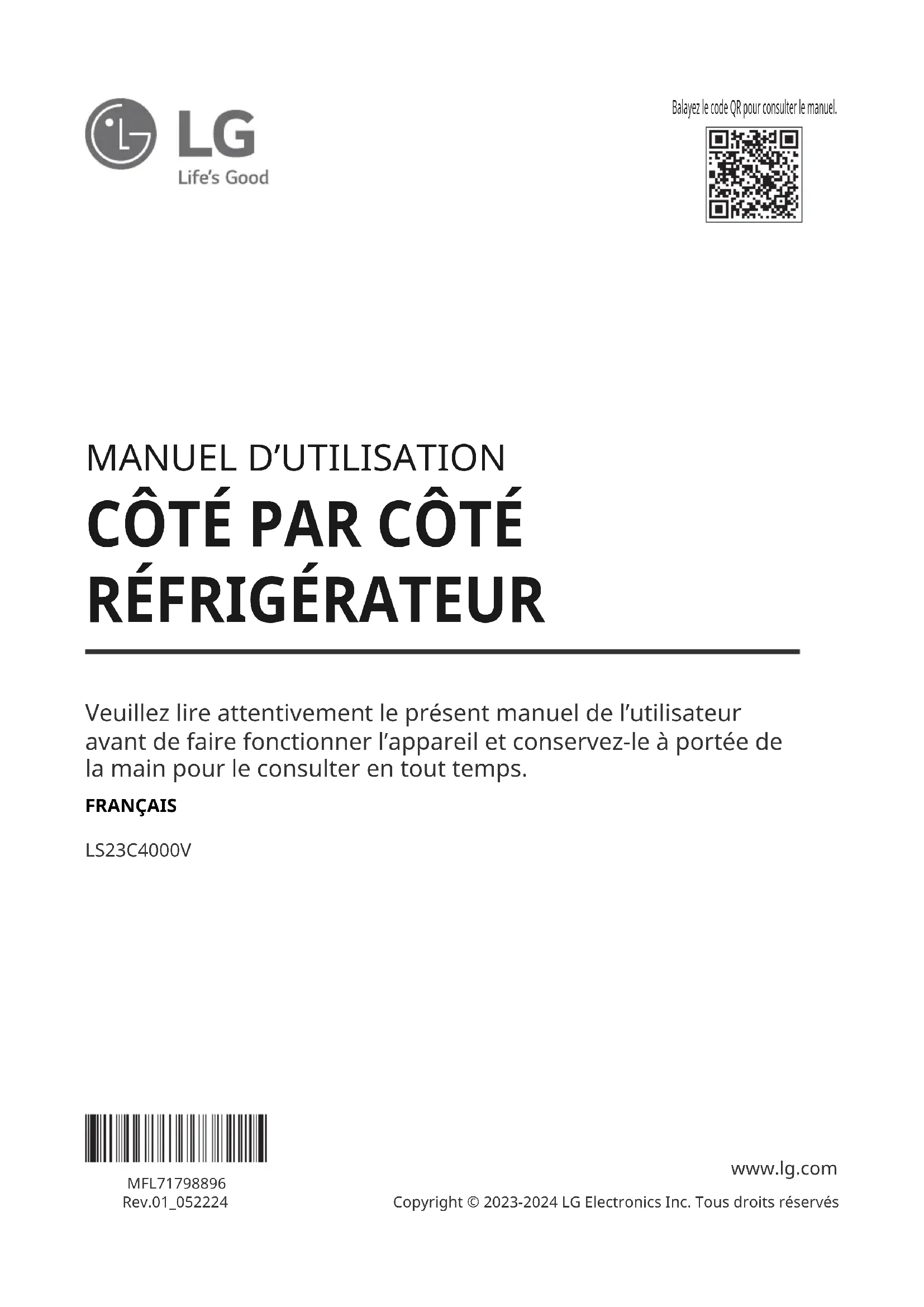Veuillez lire attentivement le présent manuel de lʼutilisateur avant de faire fonctionner lʼappareil et conservez-le à portée de la main pour le consulter en tout temps. FRANÇAIS LS23C4000V MFL71798896Rev.01_052224 www.lg.com Copyright © 2023-2024 LG Electronics Inc. Tous droits réservés Balayez le code QR pour consulter le manuel.TABLE DES MATIÈRES